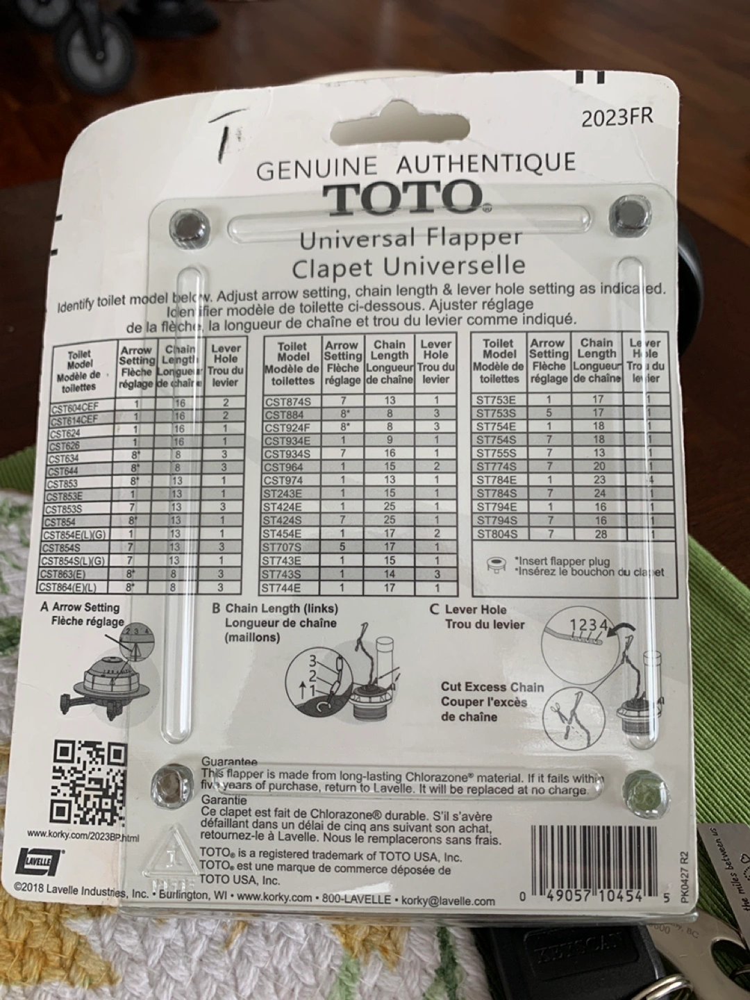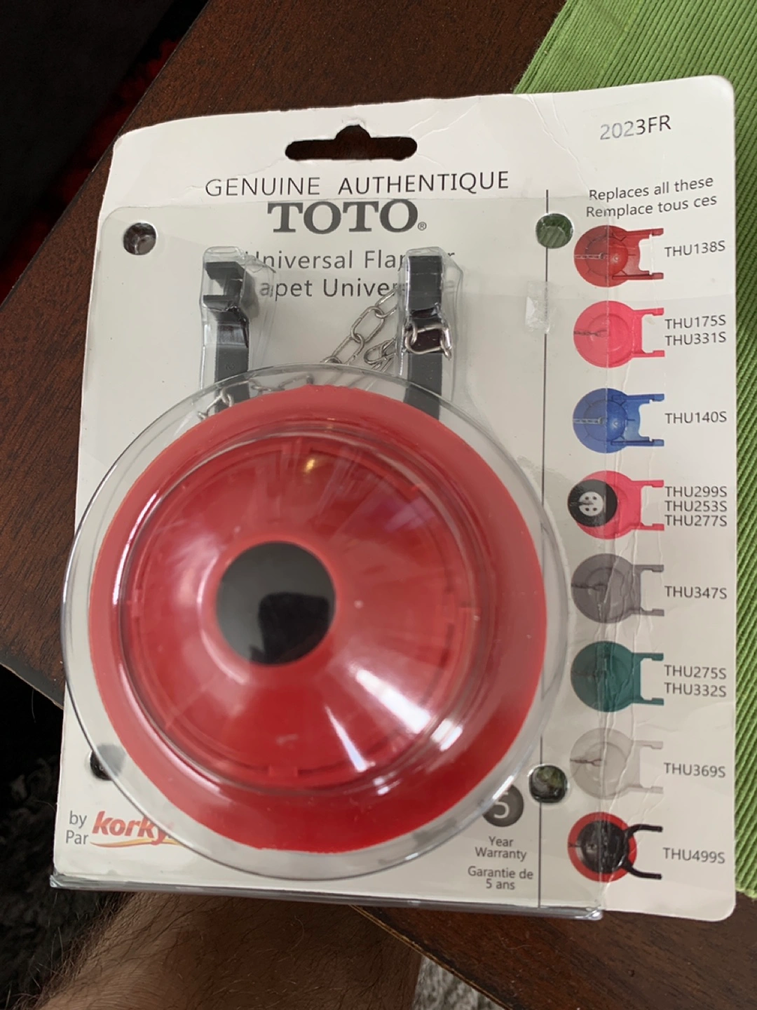 Selling a brand new, in-package TOTO Universal Flapper! This is the genuine authentique version, ready to replace your old flapper and get your toilet running smoothly again. It's a direct replacement for several TOTO models, including THU138S, THU175S, and more. Check the packaging to see if it fits your toilet!