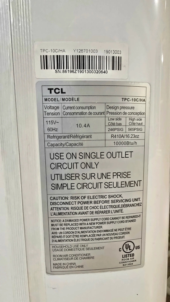 Selling a TCL portable room air conditioner, model TPC-10C/HA. It uses R410A refrigerant and has a cooling capacity of 10000 BTU/h. It requires a 115V, 60Hz power supply and draws 10.4A of current. Perfect for keeping your space cool during the summer months!