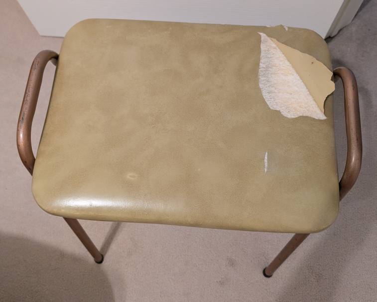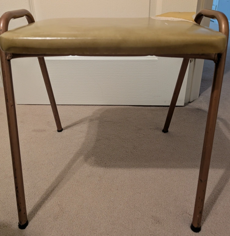 Selling a vintage stool. It's got a bit of wear and tear, as you can see in the photos, with some peeling on the seat. It could be a fun project for someone looking to restore it or give it a new life!