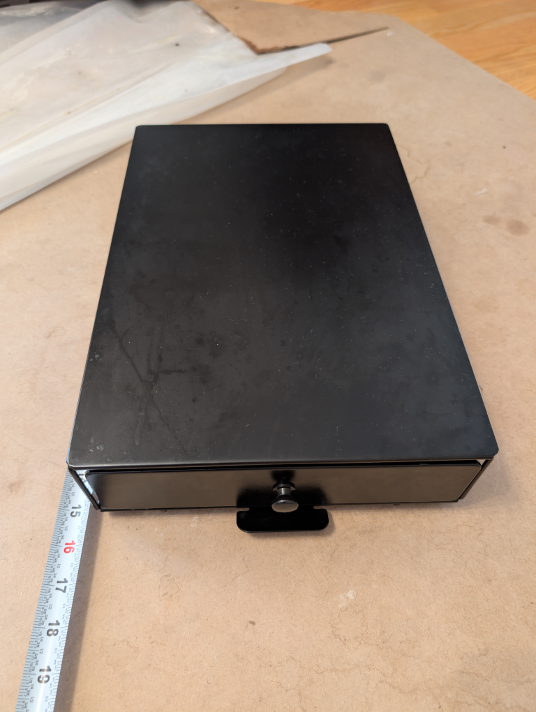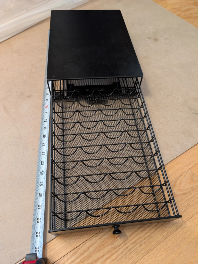 Black metal drawer organizer for Nespresso Vertuo pods. Amazon sells this for around $80 ("Nifty Vertuoline Rolling Coffee Pod Drawer – Satin Black Finish, 40 Pod Capsule Holder, Compact Under Coffee Pot Storage, Office or Home Kitchen Counter Organizer"). You can put your coffee machine on top of it, and it has wheels so you can easily pull the whole thing out from under a cabinet. 15"L x 10.5"W x 3.5"H.
