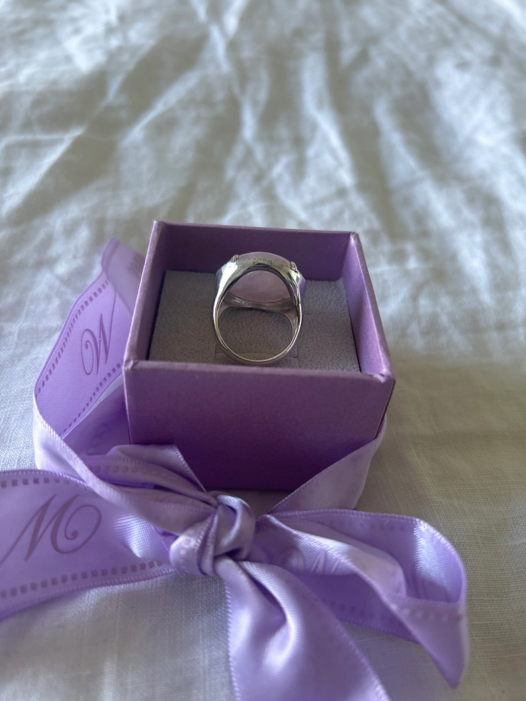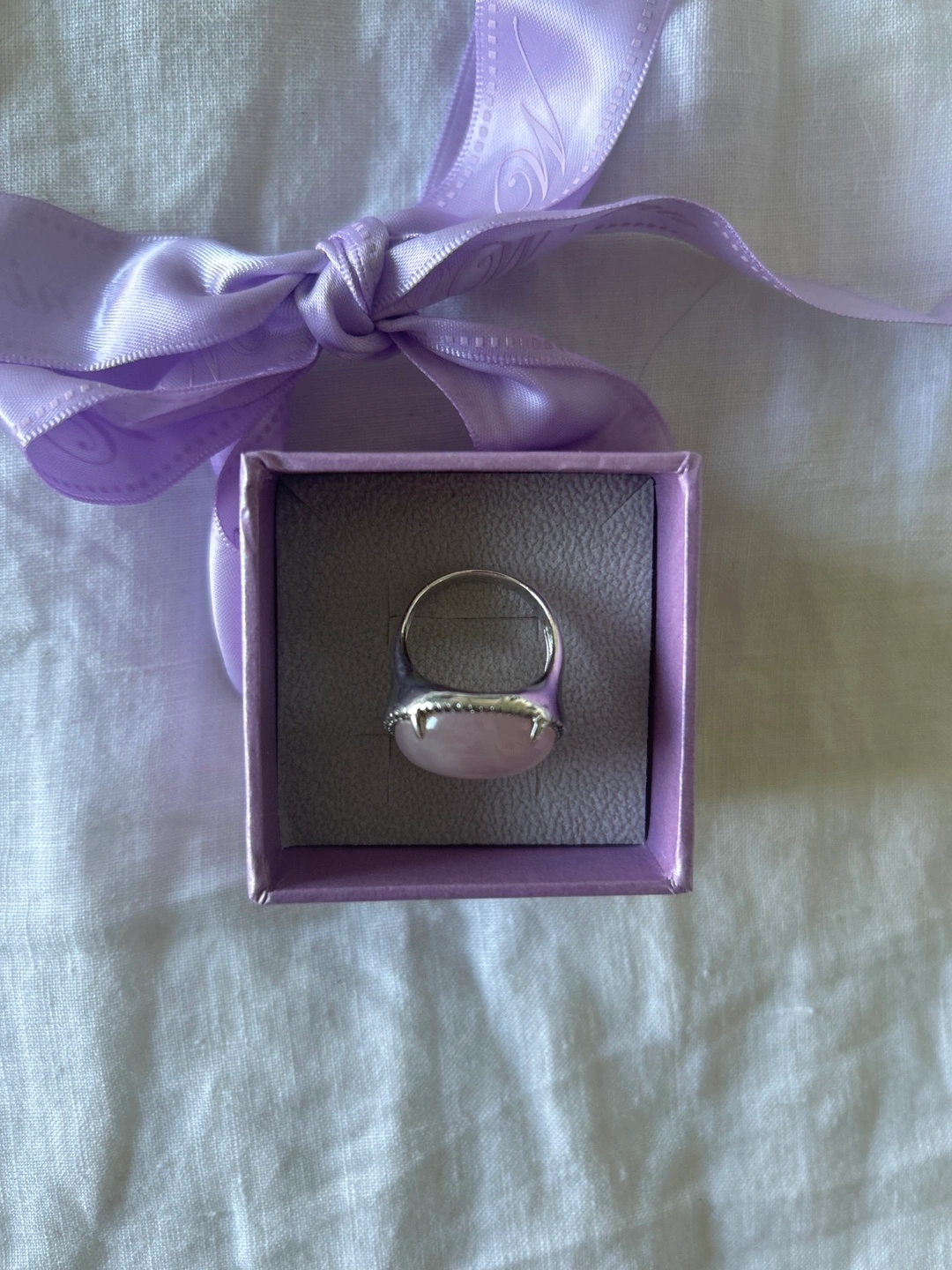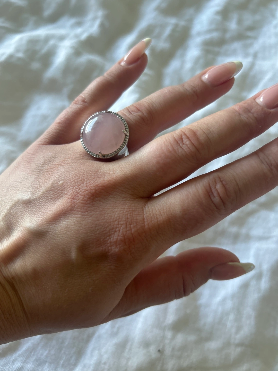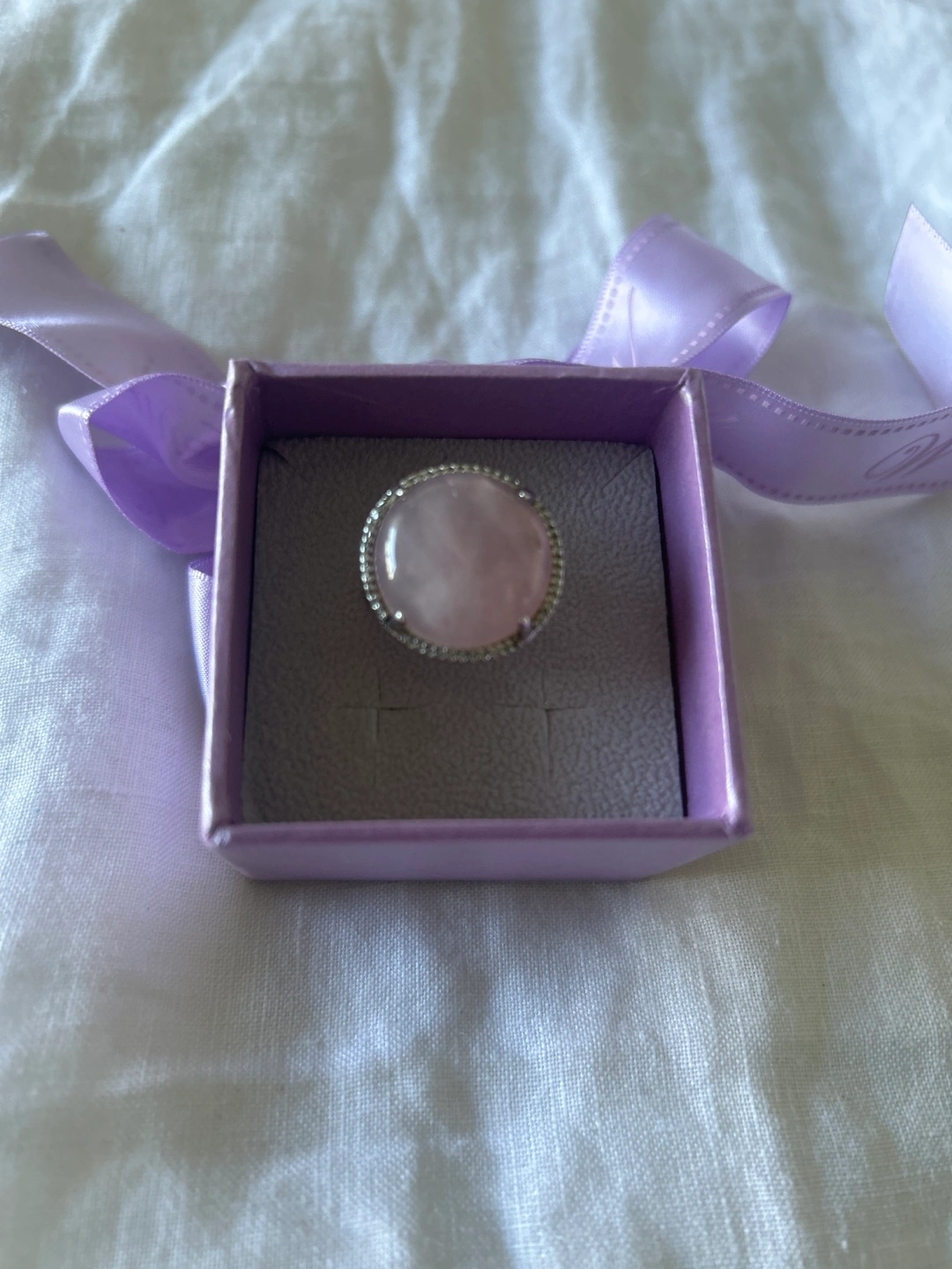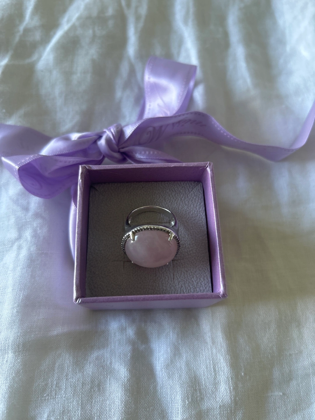 Selling a beautiful rose quartz ring. The ring features a lovely, soft pink rose quartz stone set in a silver-tone band. It's in great condition and ready to be worn!