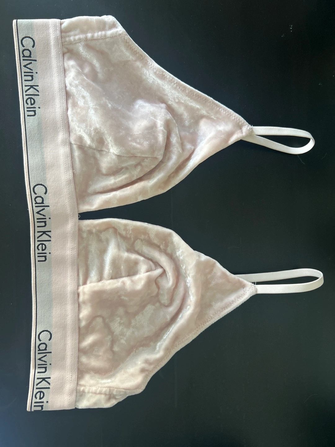 Selling a Calvin Klein bra in size L. The bra is a velvet light pink colour and in great condition
