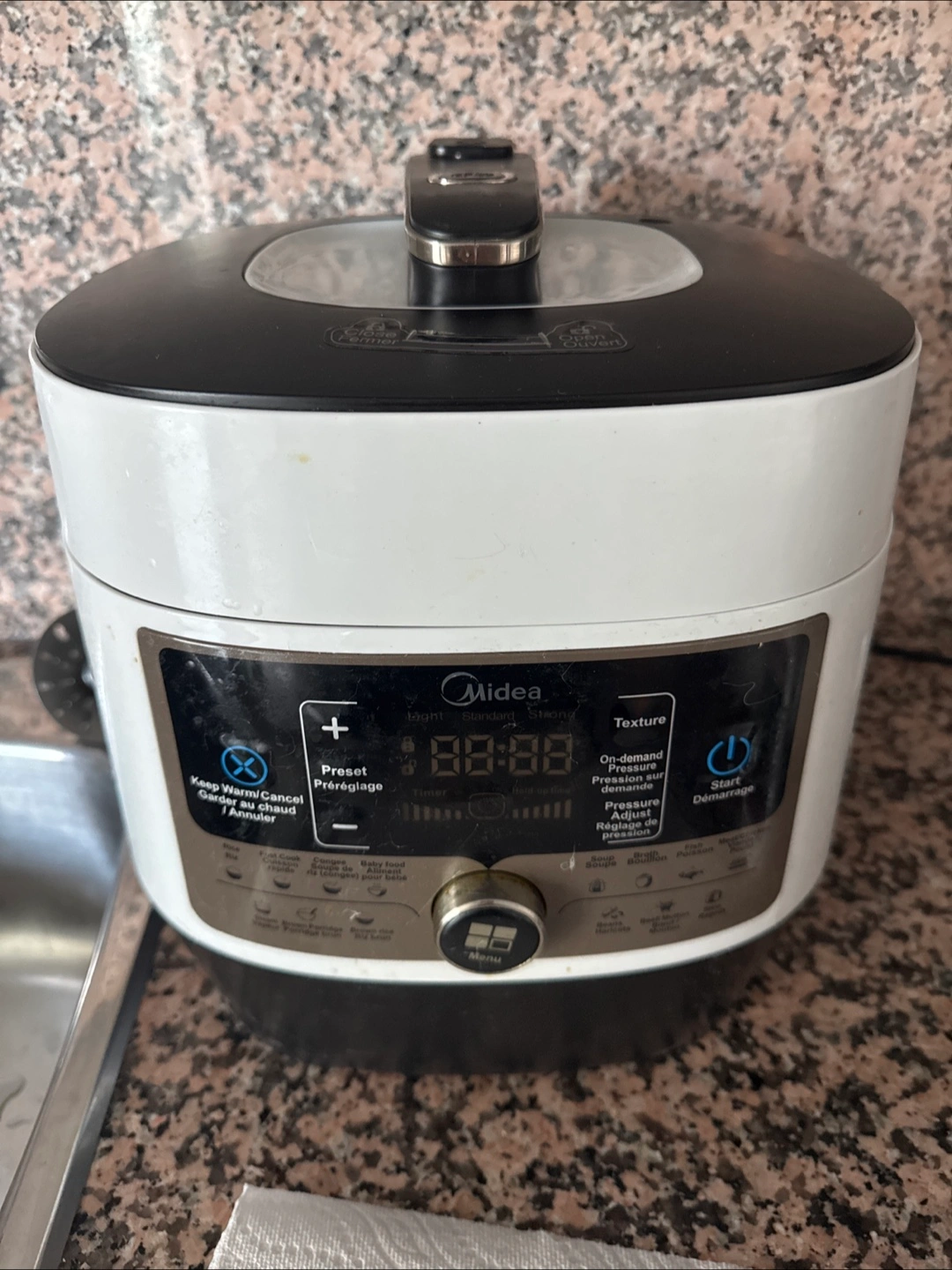 Selling a Midea pressure cooker. It has options for keep warm/cancel, preset, light/standard/strong, timer, and texture settings. There are also settings for soup, broth, fish and meat