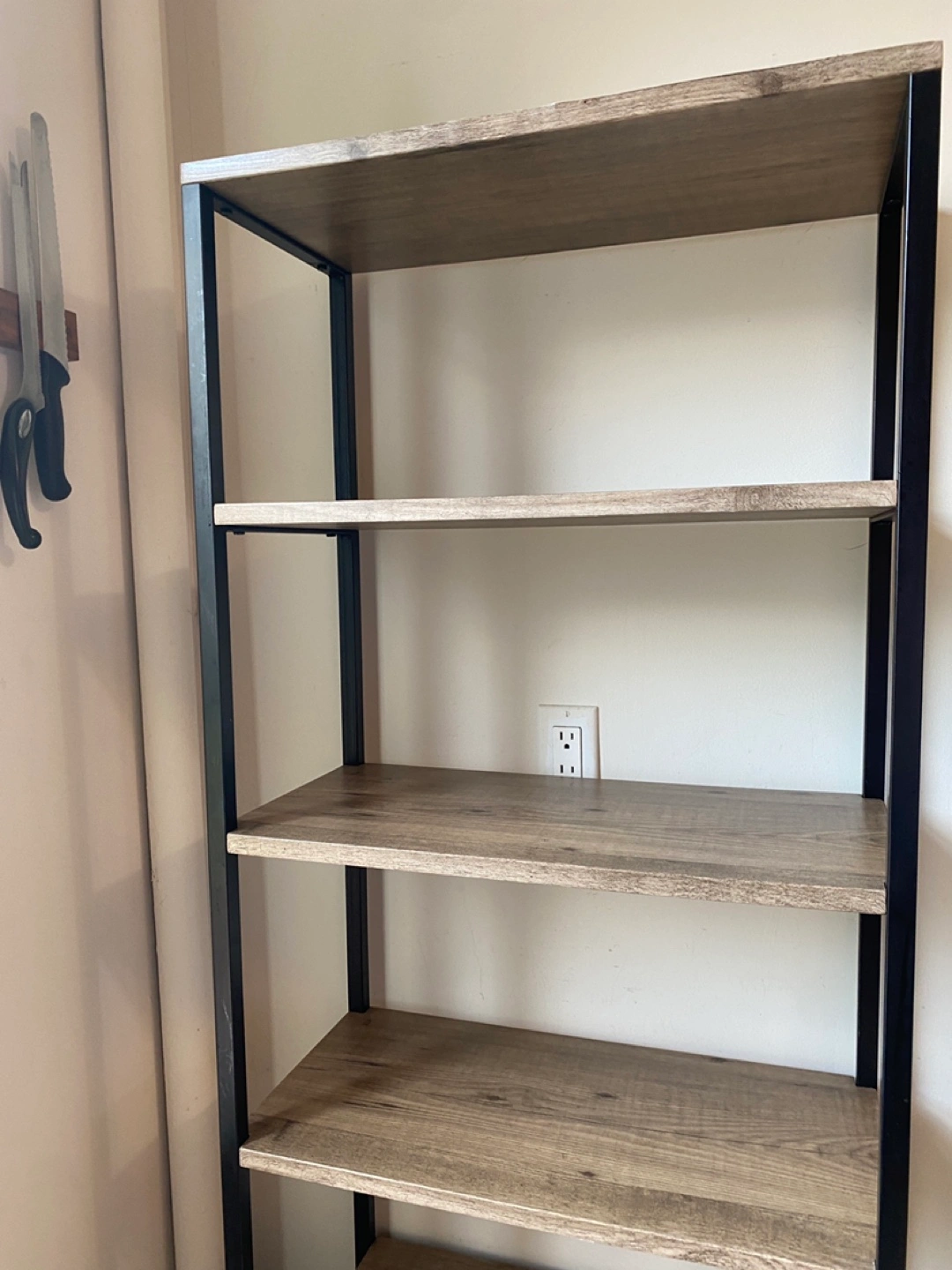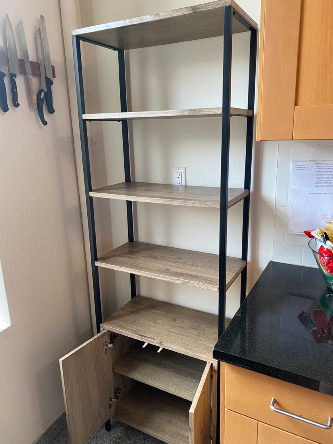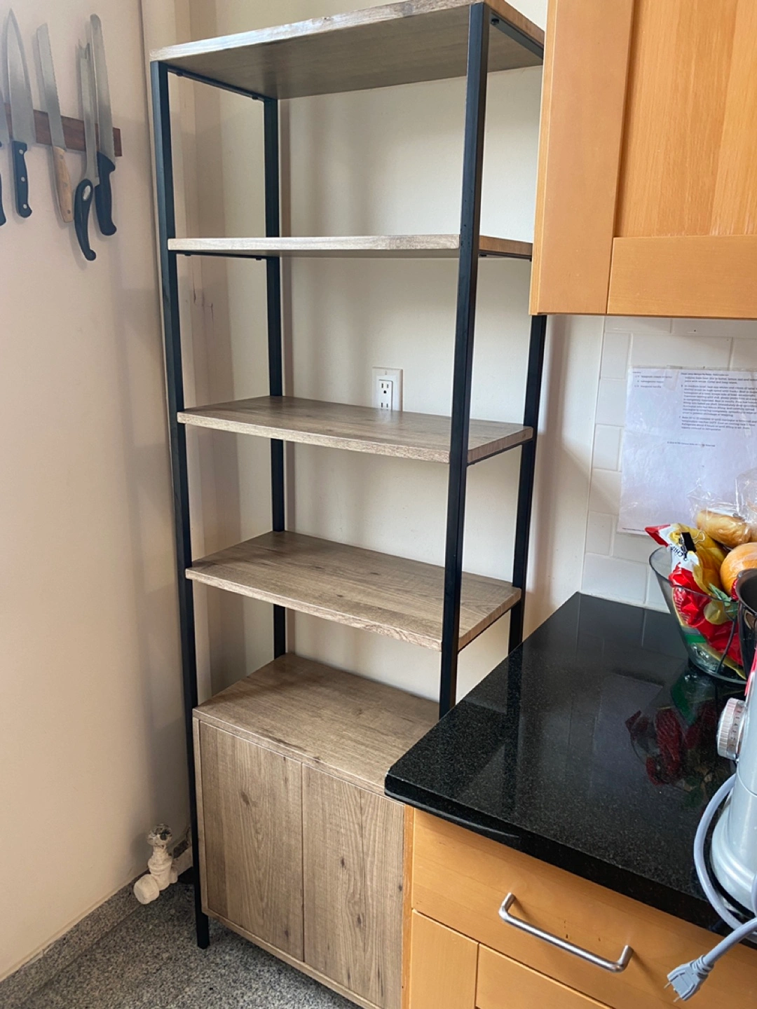 This is a tall open shelf with a cabinet at the bottom. It's made of laminate (veneer over particleboard) and metal. The shelf is about 6 feet tall and 2 feet wide.