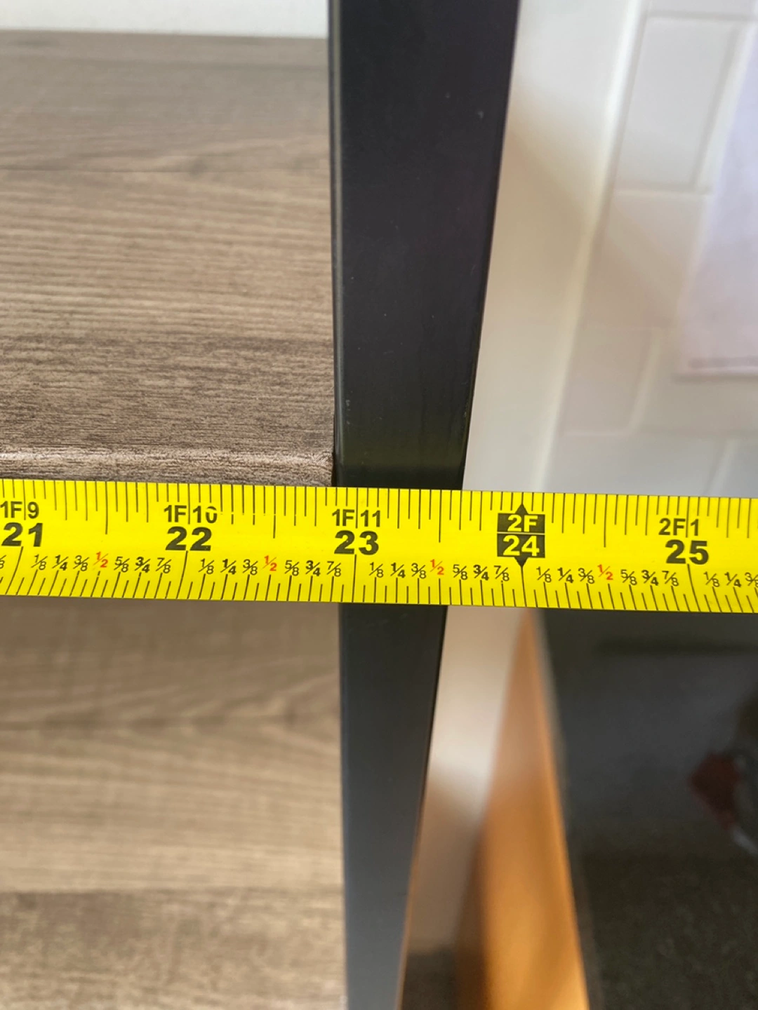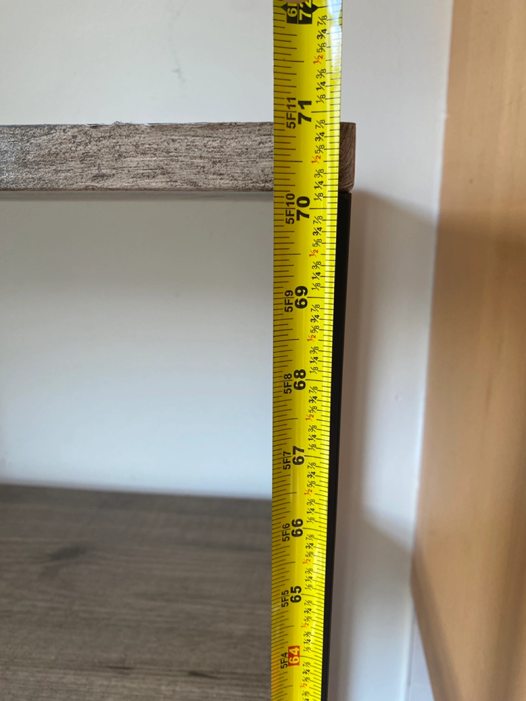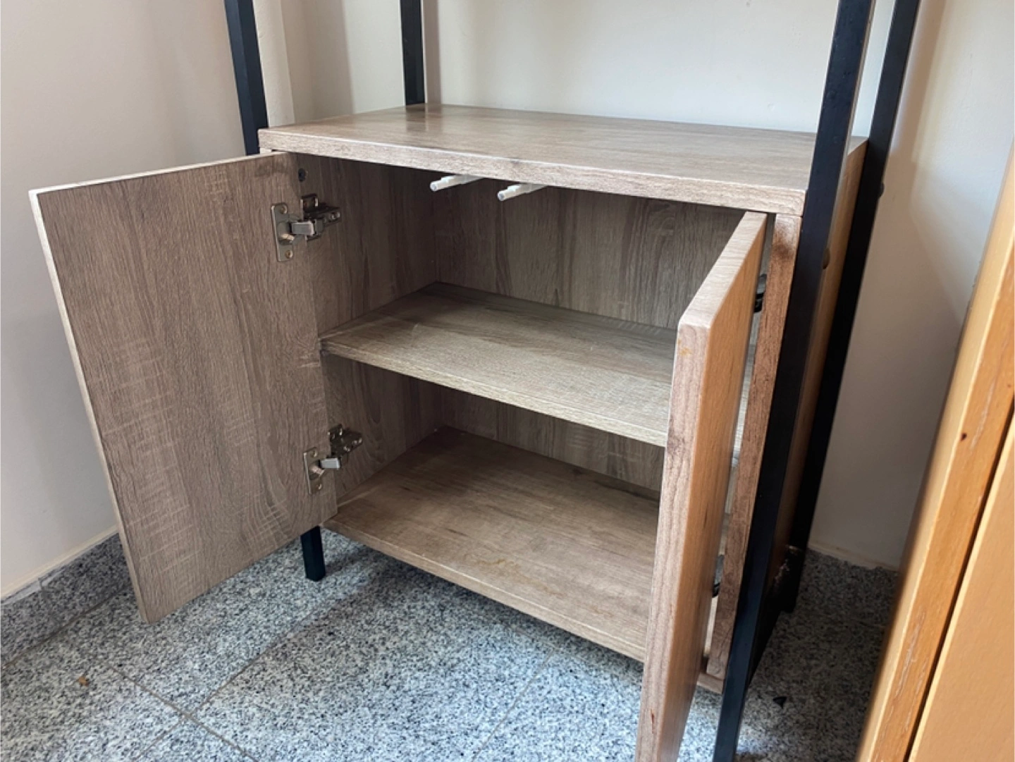 This is a tall open shelf with a cabinet at the bottom. It's made of laminate (veneer over particleboard) and metal. The shelf is about 6 feet tall and 2 feet wide.