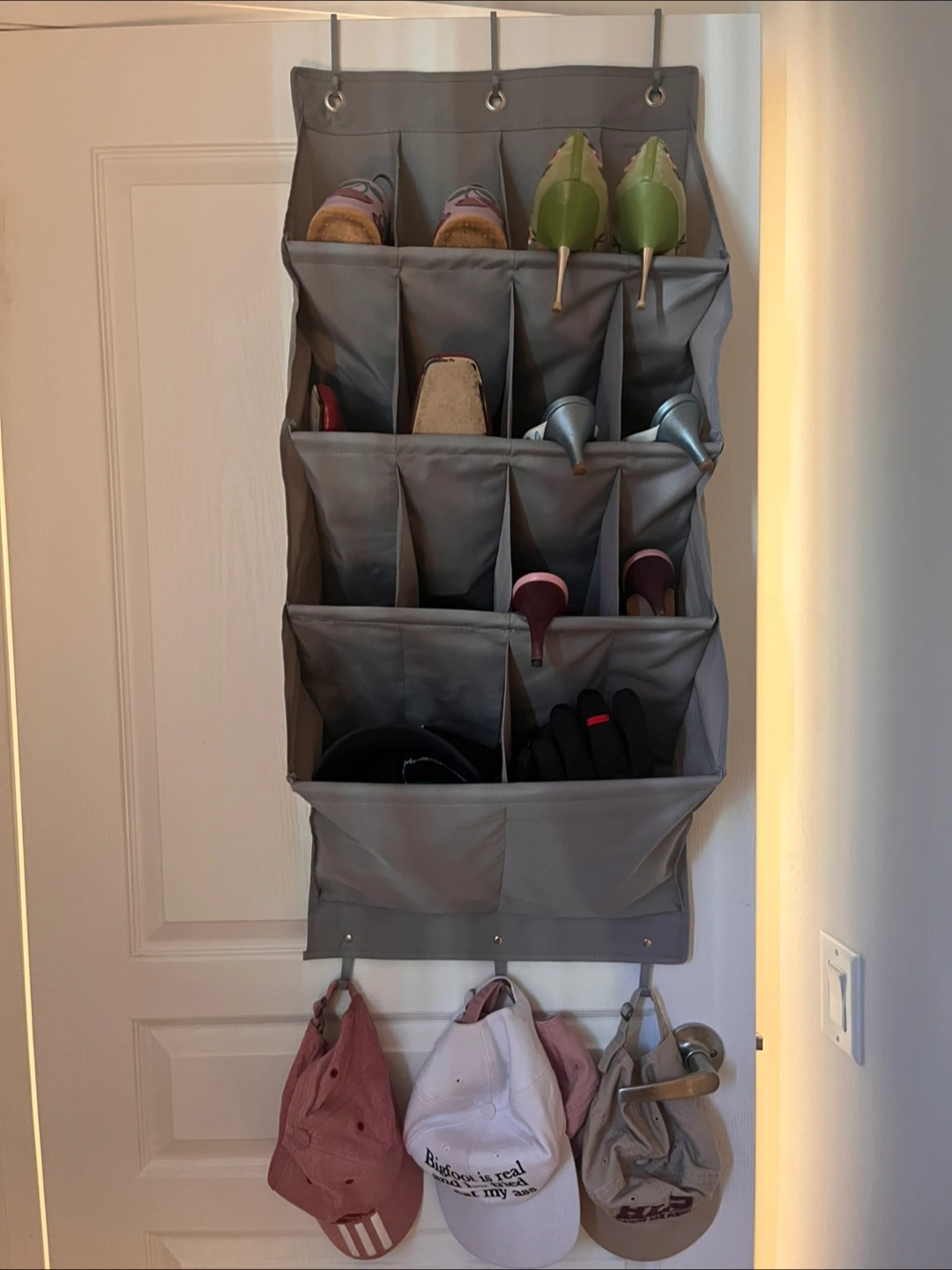 Keep your shoes and accessories neatly organized with this over-the-door hanging organizer! It features multiple pockets to hold shoes, hats, gloves, and more. A great space-saving solution for any room.