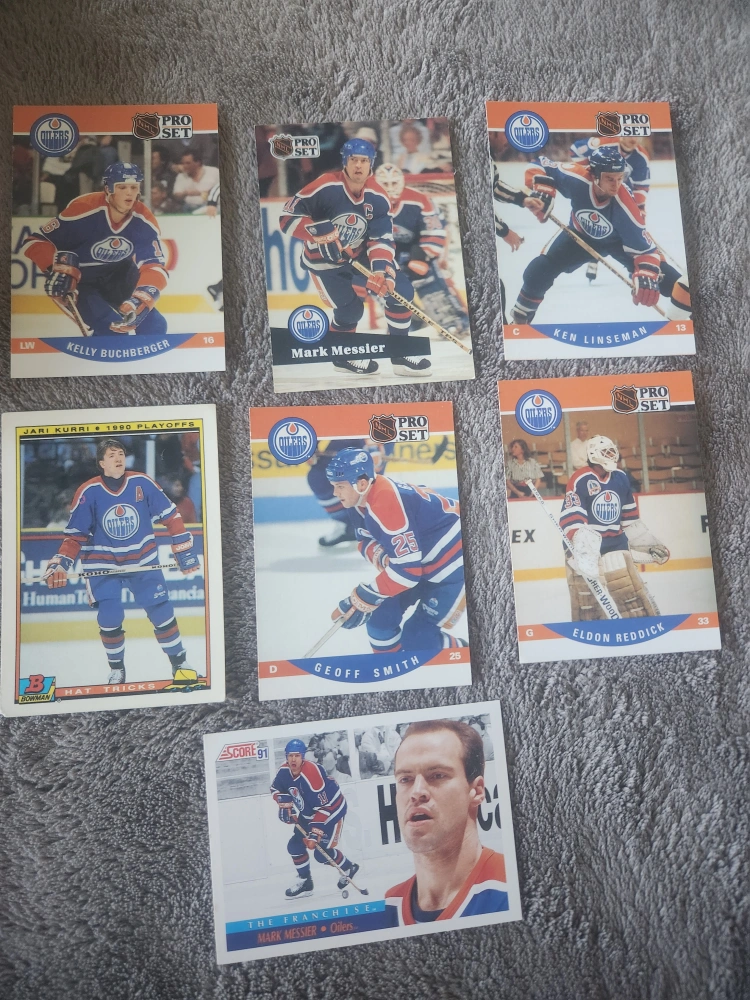 Selling a collection of vintage Edmonton Oilers hockey trading cards. Includes players like Mark Messier, Jari Kurri, Kelly Buchberger, Ken Linseman, Geoff Smith and Eldon Reddick. Great for any Oilers fan or collector!