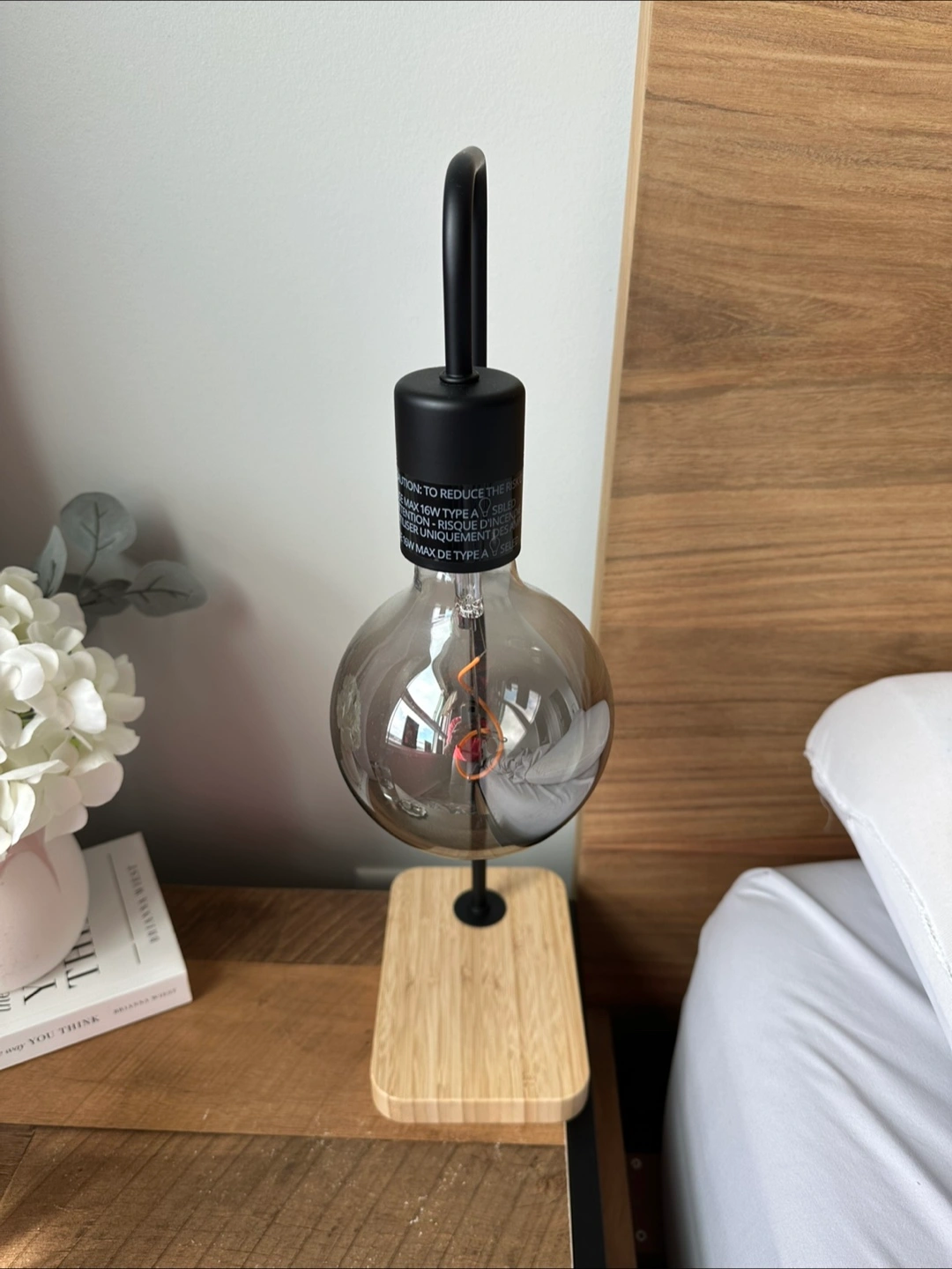 Here's a stylish table lamp with a wooden base! The bulb is a unique shape and design, perfect for adding a bit of character to any room. Two for sale- $20 each obo.