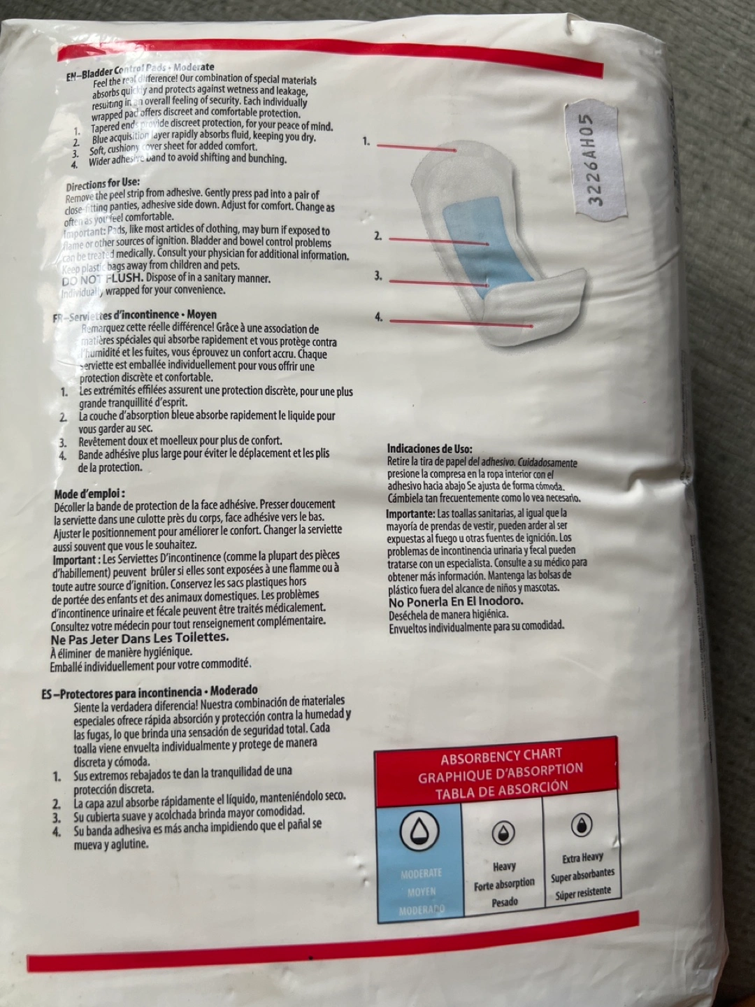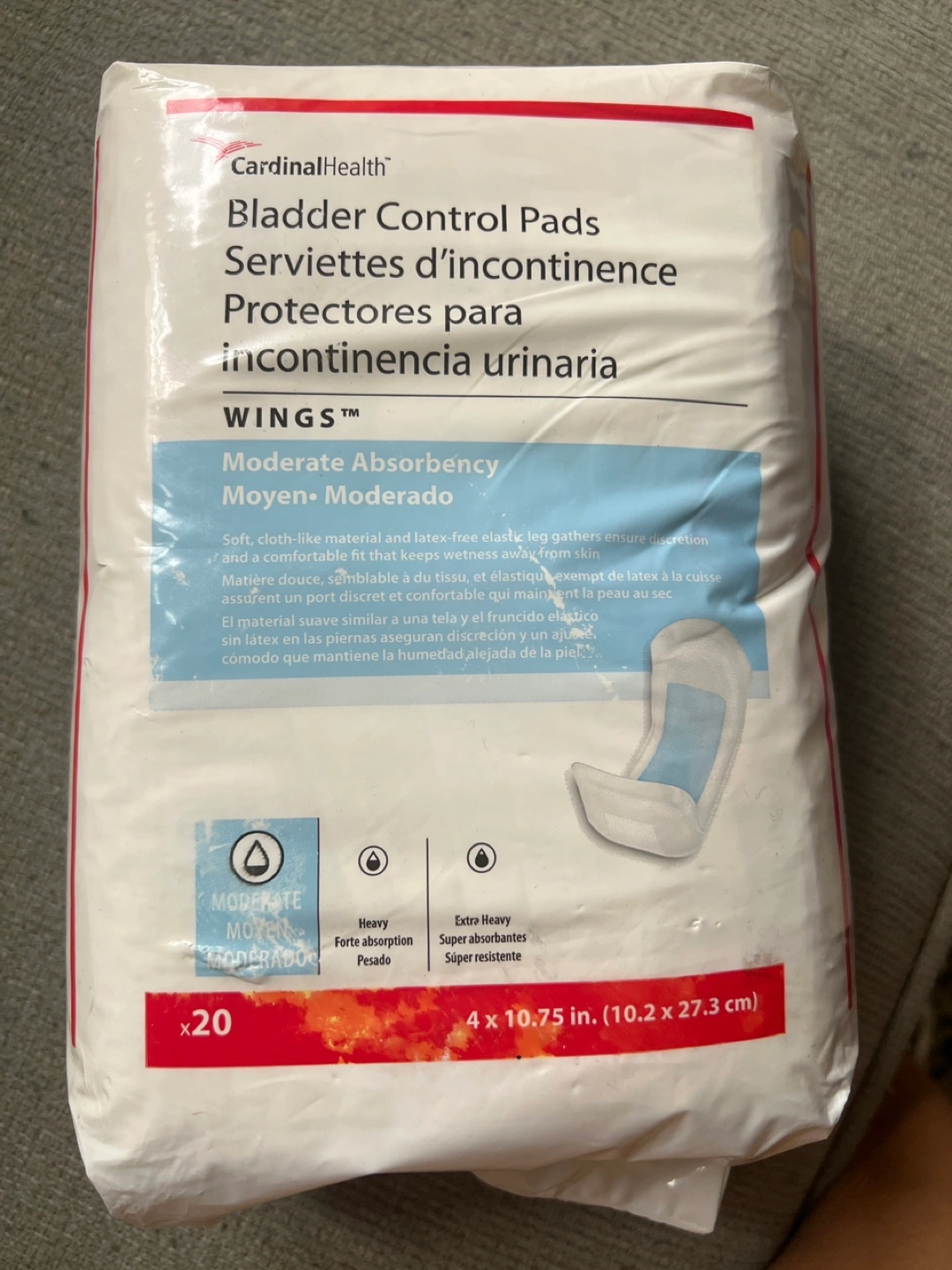 Cardinal Health Bladder Control Pads provide moderate absorbency for incontinence. They have a soft, cloth-like material and latex-free elastic leg gathers to ensure discretion and a comfortable fit. Each pad measures 4 x 10.75 inches (10.2 x 27.3 cm).