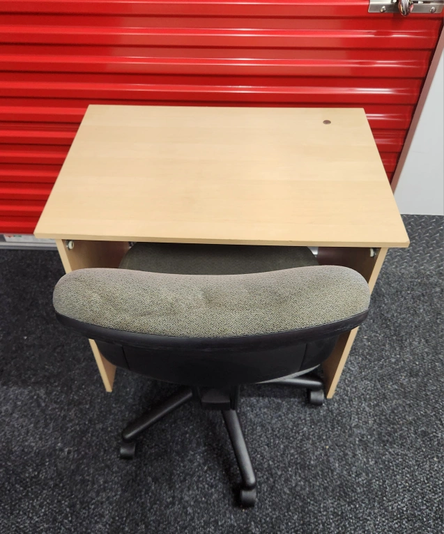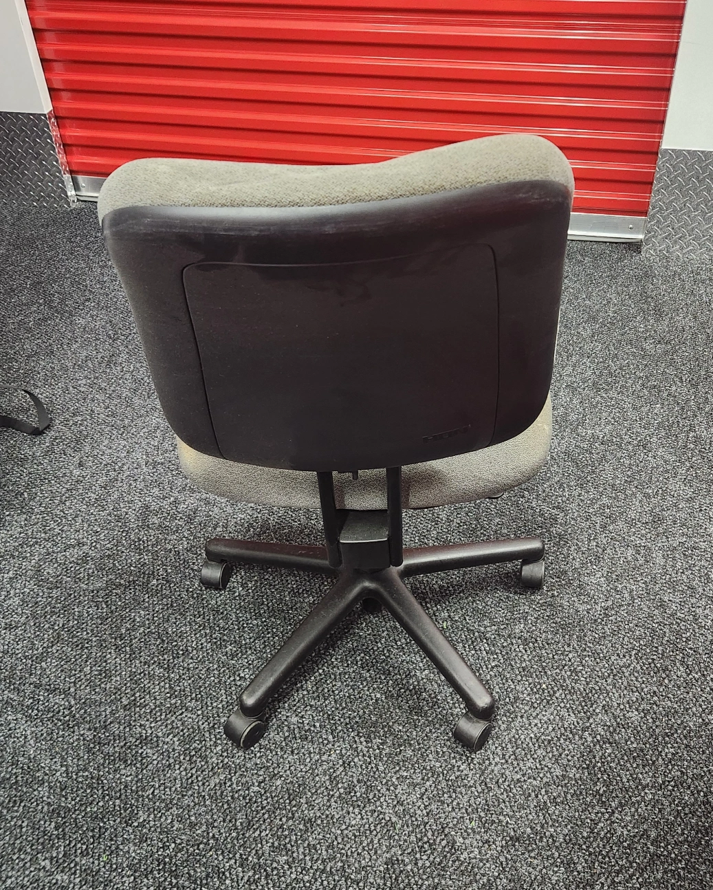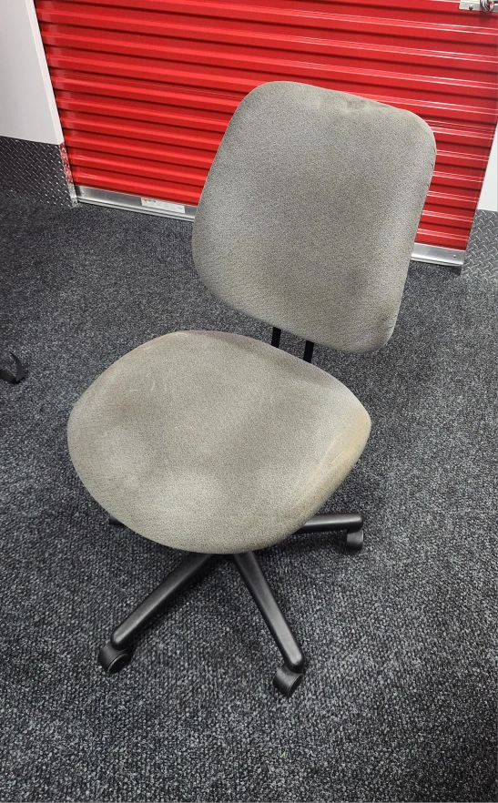 Office chair in gray color. It has a back and a seat with wheels. It's great for working at a desk or in an office setting. It has a slow roll and could use some cleaning but otherwise comfortable and stable.