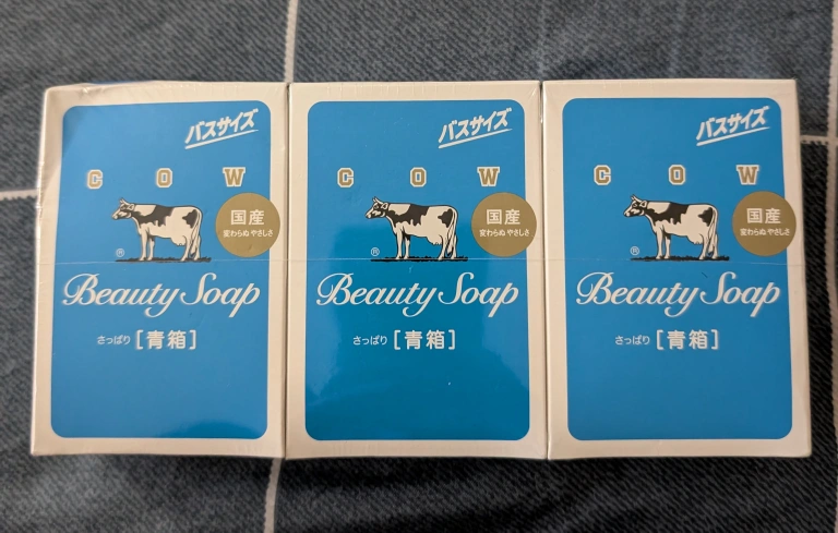 Selling a pack of three COW Beauty Soaps! These soaps are bath-sized and come in a refreshing blue box. They are known for their gentle and unchanging kindness to the skin.