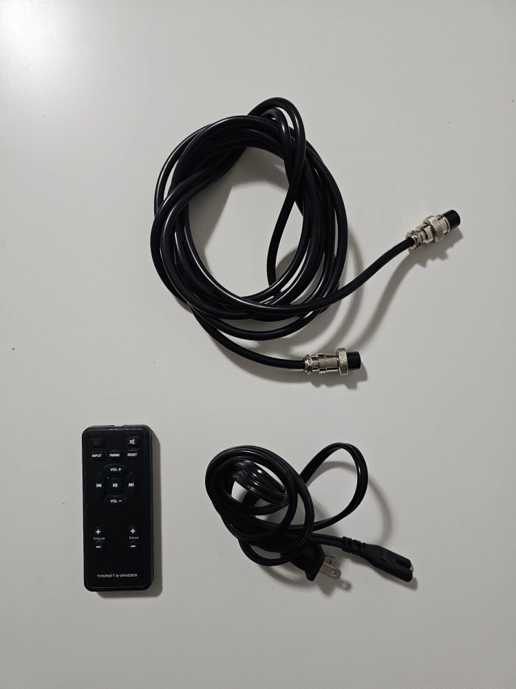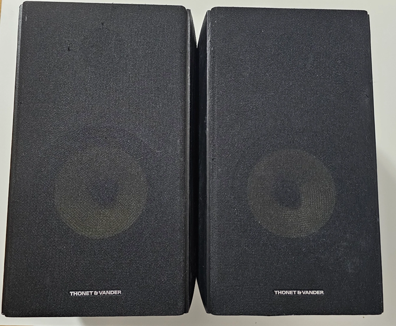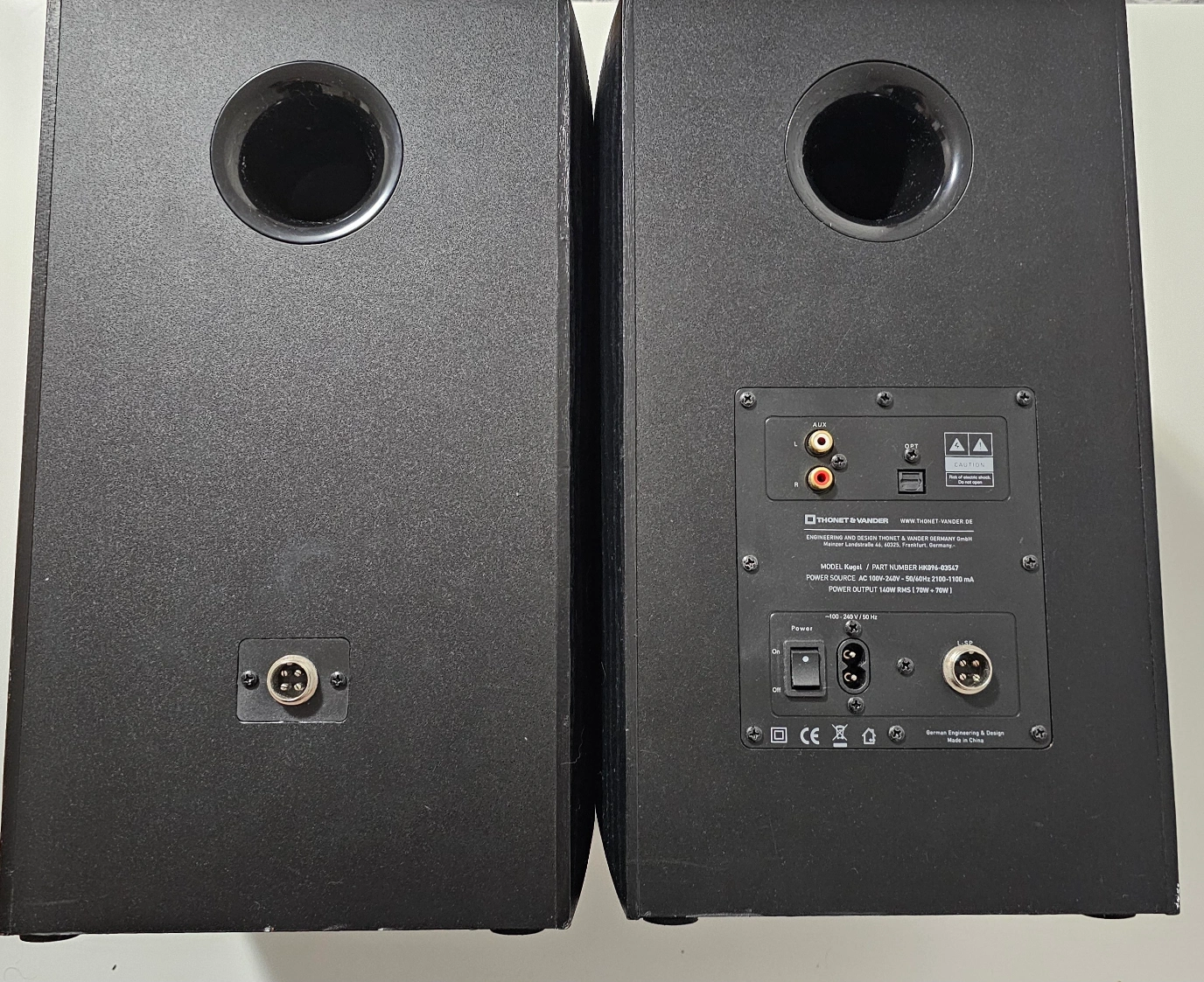 Selling a pair of Thonet & Vander Musik speakers in black. They're ready to bring some serious sound to your space, also a great option for the up and coming music producer or DJ. Includes the remote control for this system. There is a wire for power and a wire for connecting the speakers together, as seen in the last picture. Can be connected through an audio jack if a bluetooth connection is unwanted or uneeded. Dimensions 12.2 x 12.2 x 16.6 in Excellent condition, audio, and controls work completely. Minor structural damage on the cover of one of the speakers, the clips that go into the top section of one speaker broke off. Could be potentially fixed within a few minute of delicate work however it is beyond my capabilities.