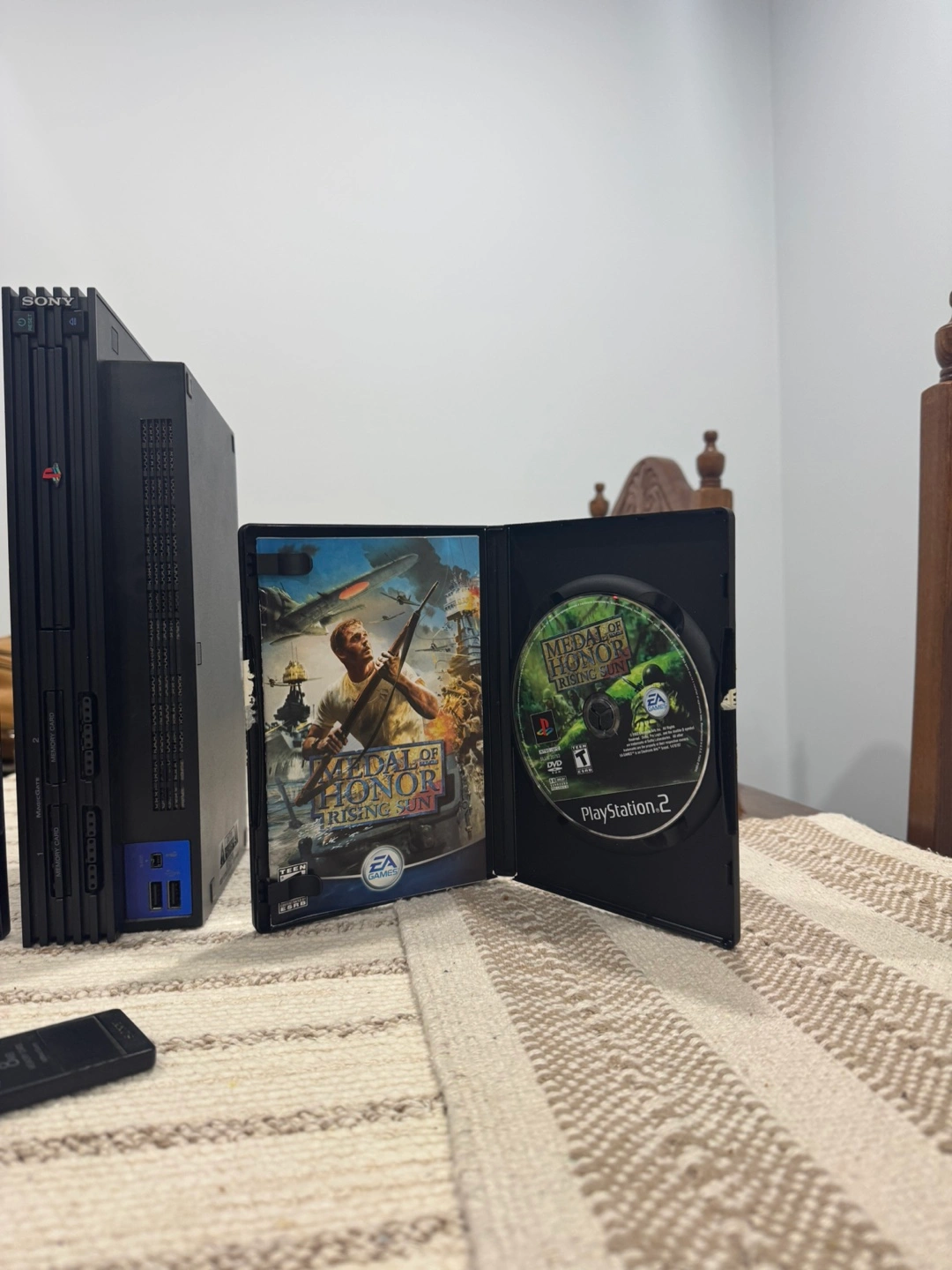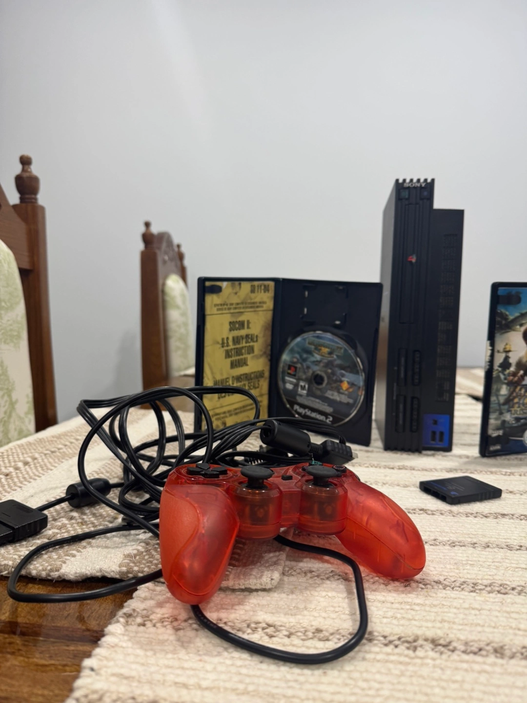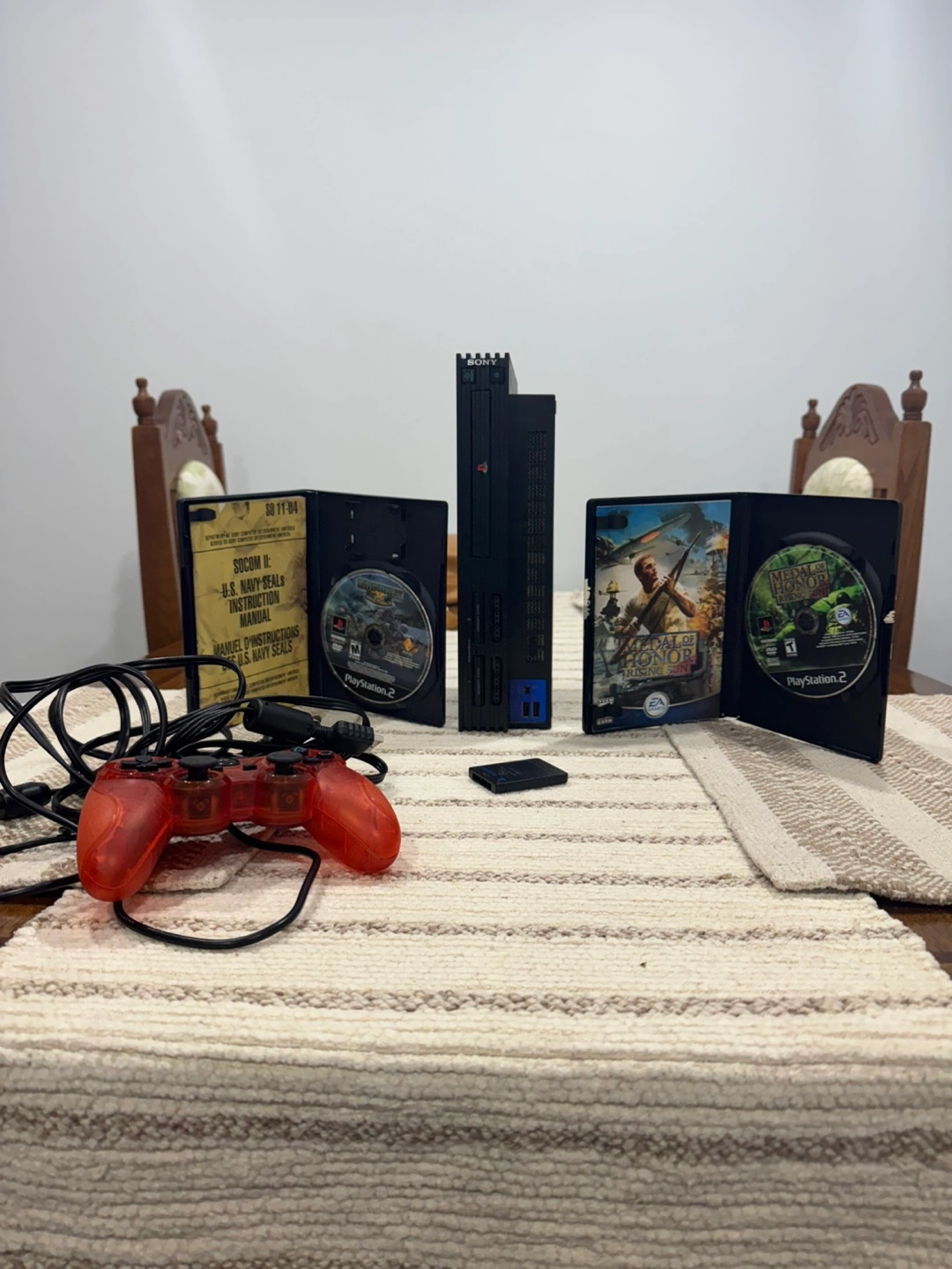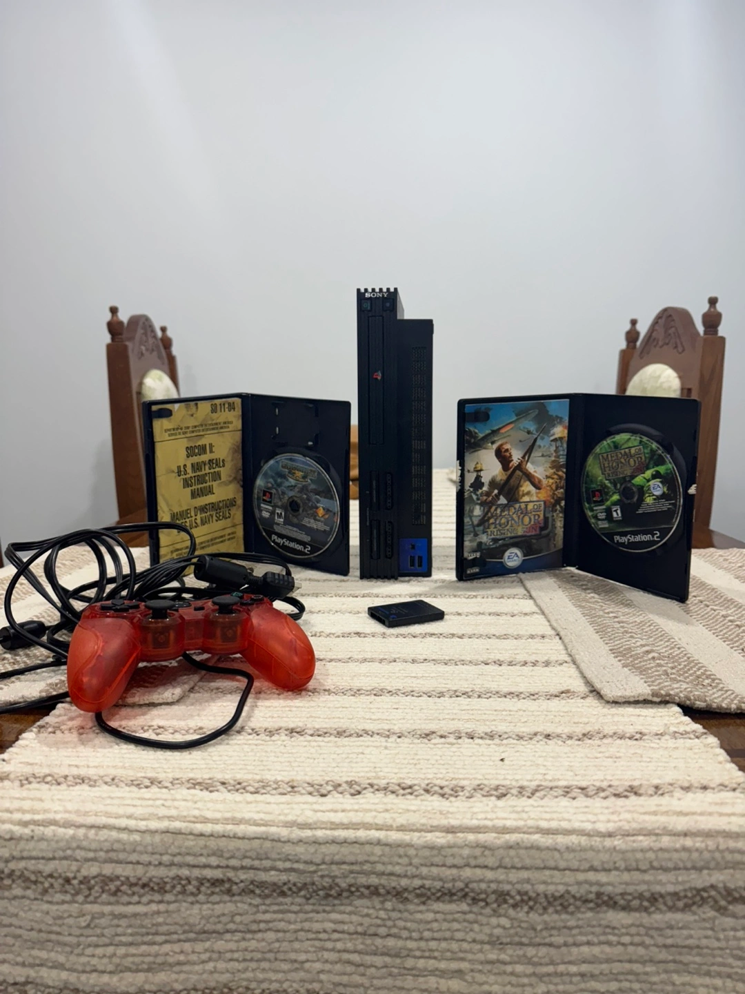 Selling a PlayStation 2 console with a red controller, two games (SOCOM II: U.S. Navy Seals and Medal of Honor Rising Sun), and a memory card. All in good working condition!