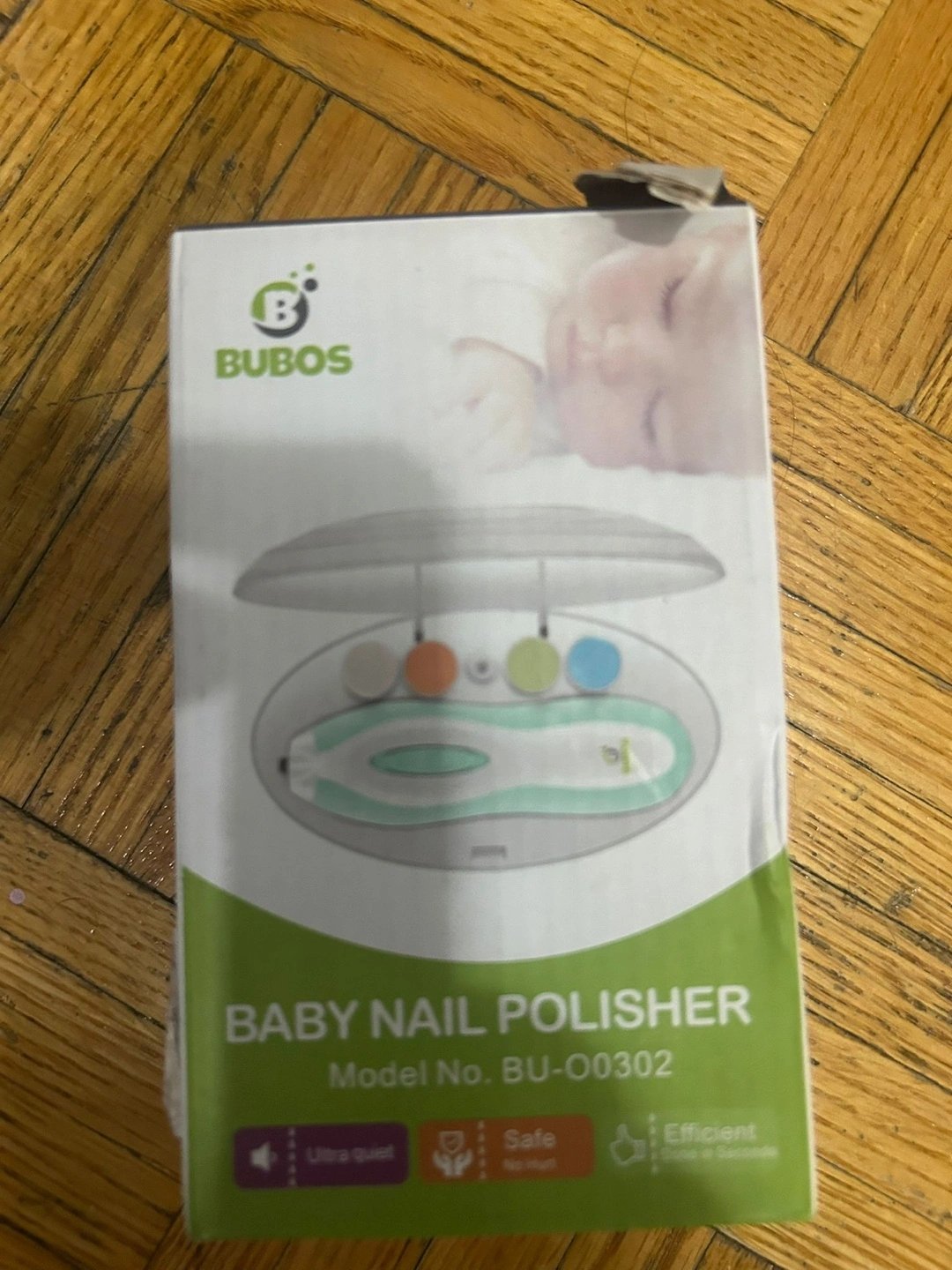Selling a BUBOS baby nail polisher, model number BU-00302. It's designed to be ultra-quiet and safe for your little one. It also claims to be efficient, finishing in seconds!