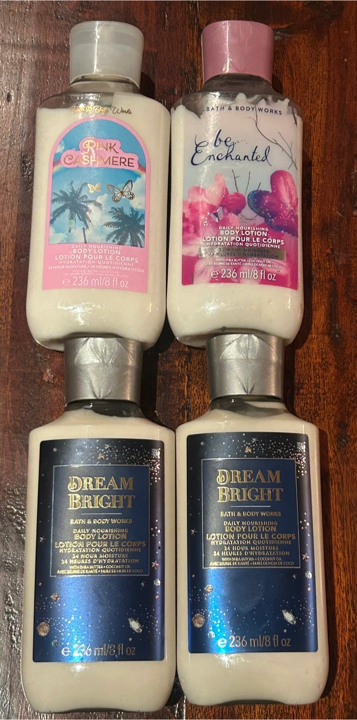 Selling a set of four Bath & Body Works daily nourishing body lotions. Includes the scents Pink Cashmere, Be Enchanted, and Dream Bright. Each bottle contains 236 ml / 8 fl oz, perfect for keeping your skin moisturized!