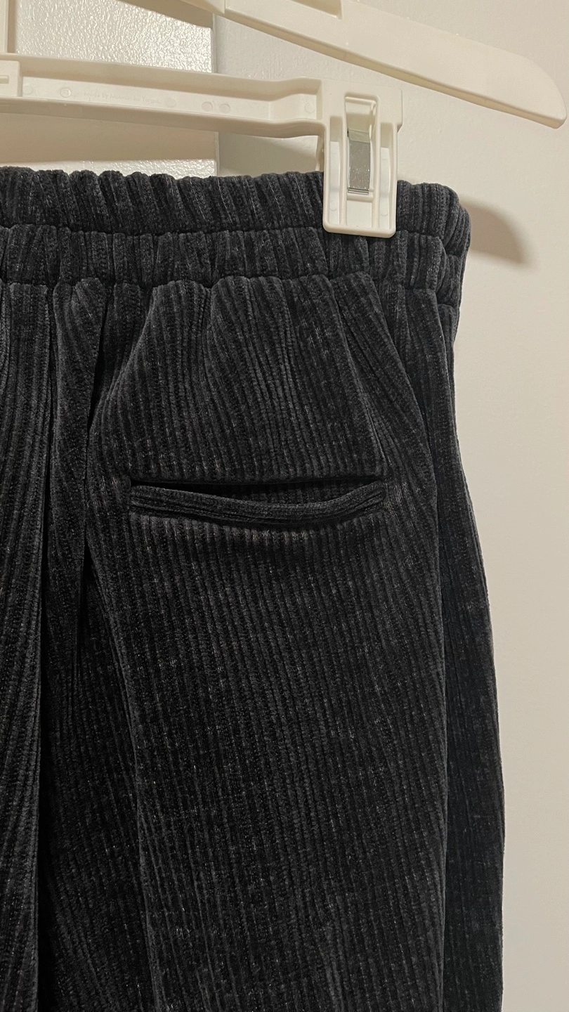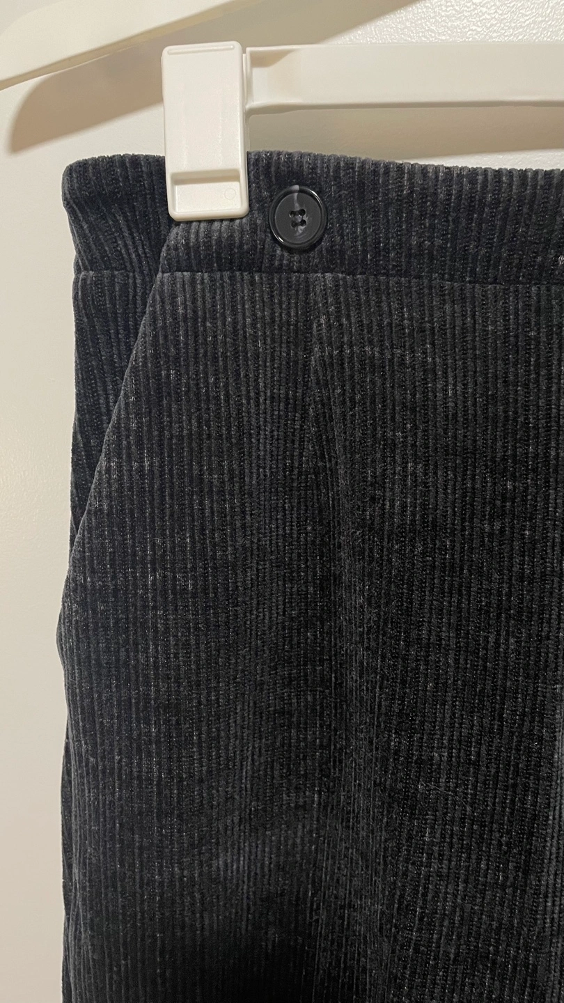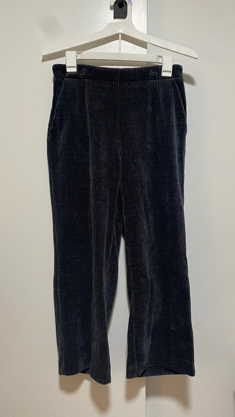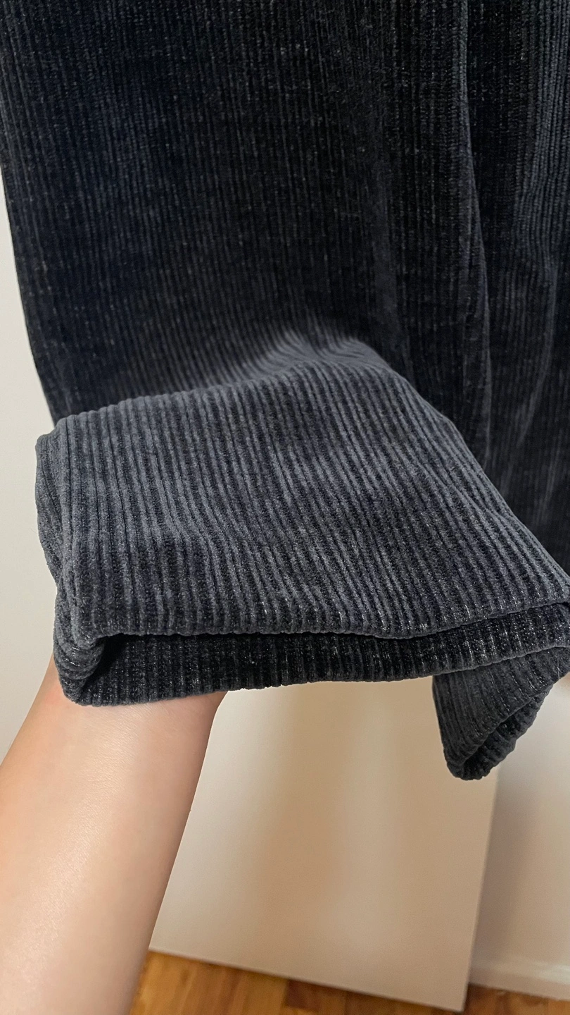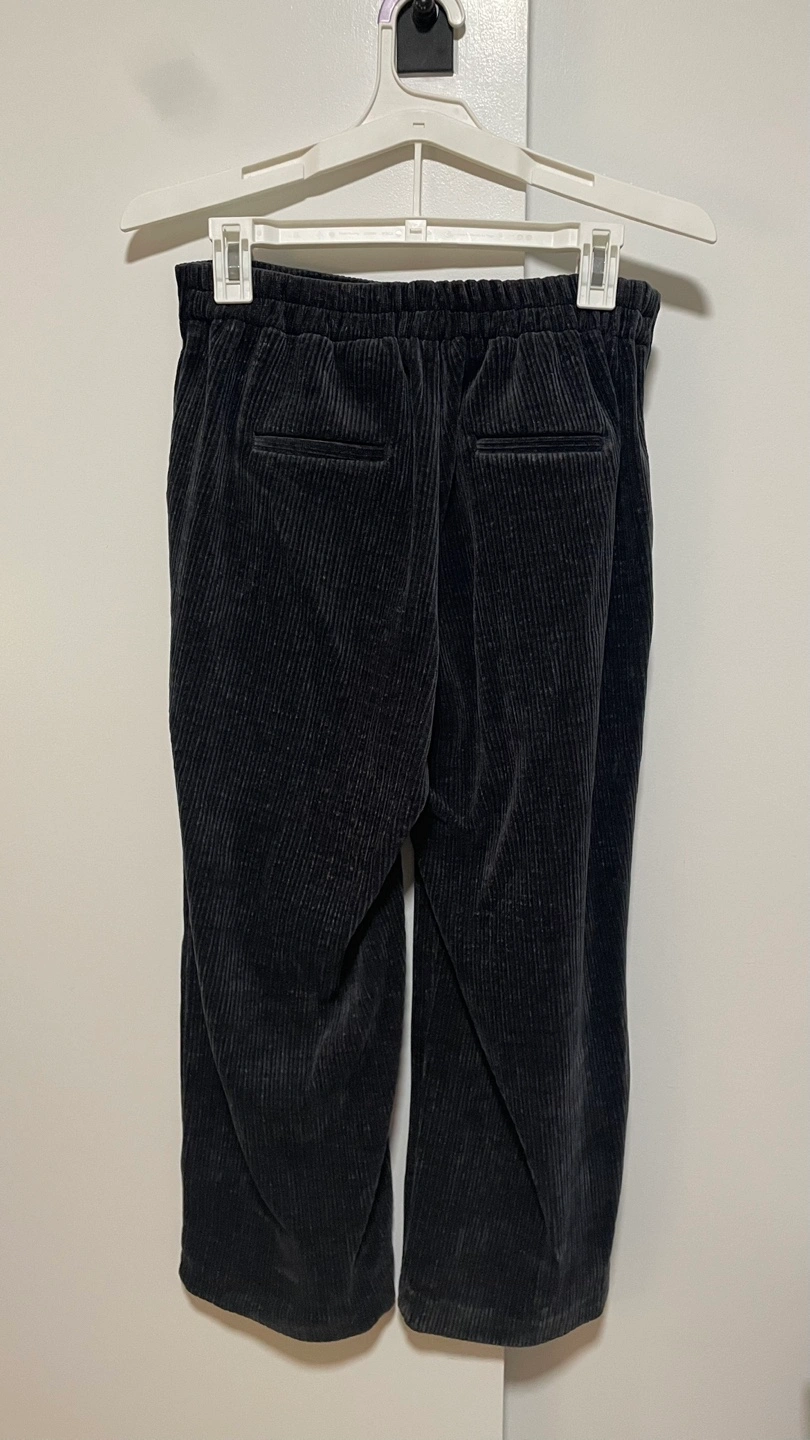 Charcoal/Dark Grey corduroy pants in black. In great condition and lightly worn. The material is so soft and plush, perfect for everyday wear. The hem length is slightly on the shorter side, and looks great with boots or loafers.