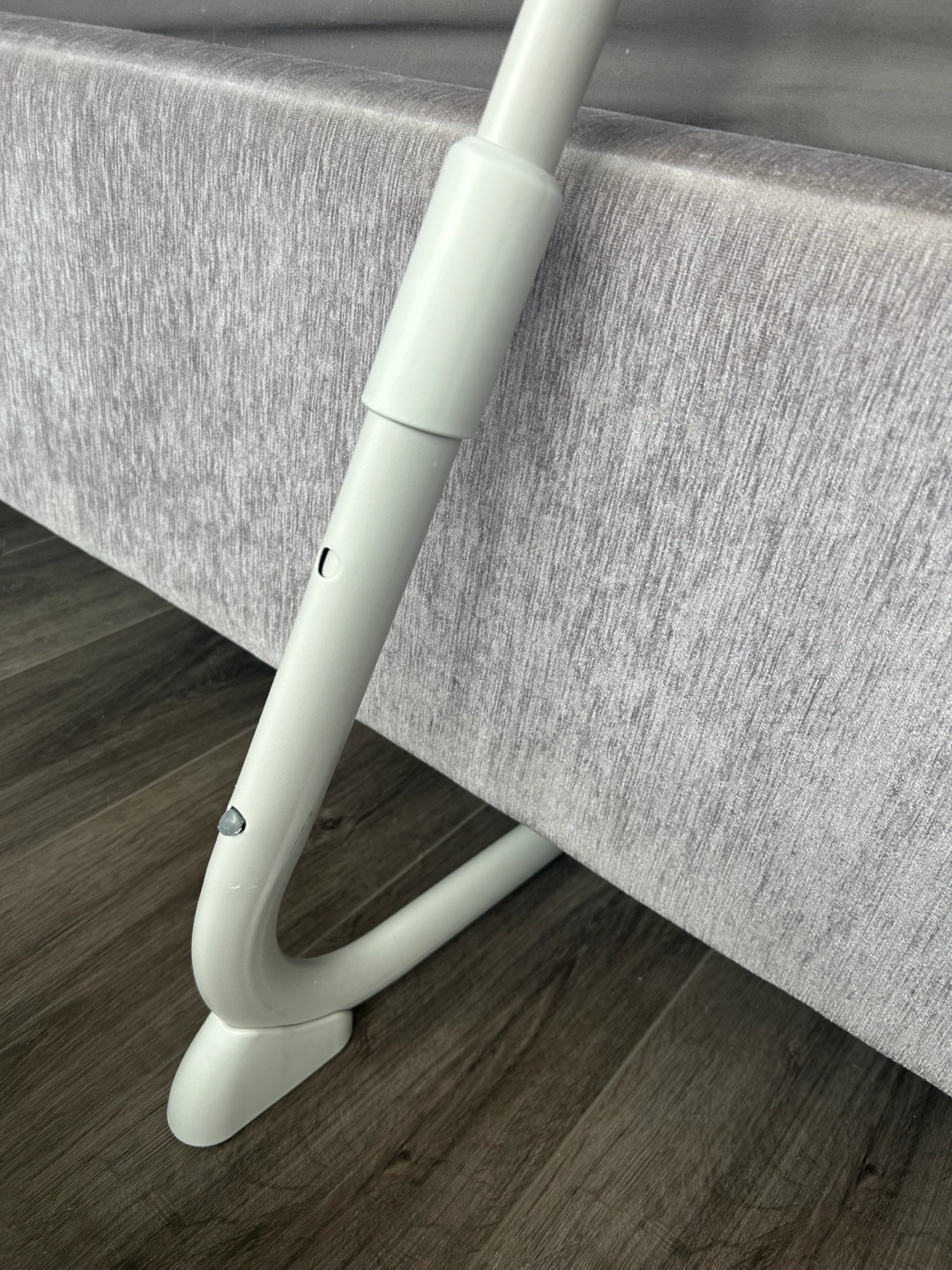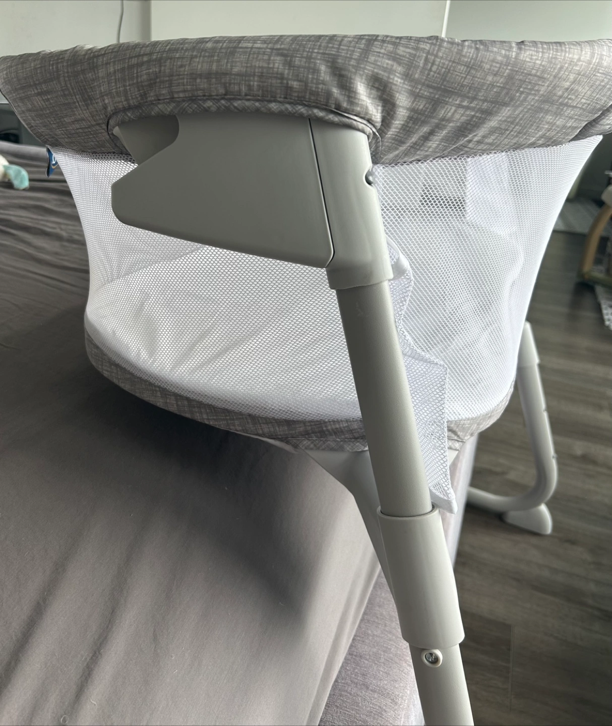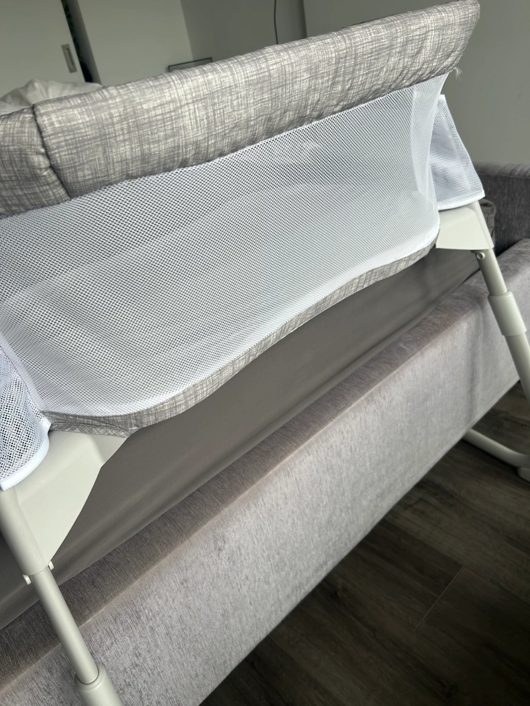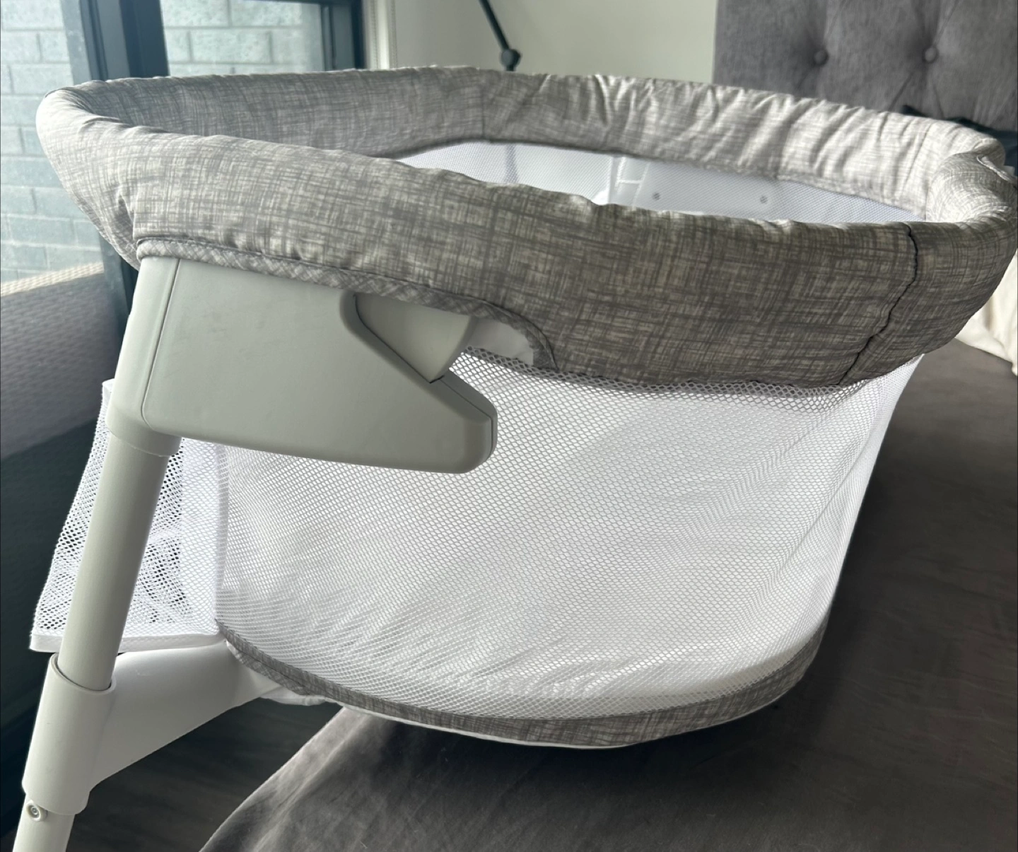 Portable and easy setup. It’s a grey colour with a white mesh. Perfect for keeping your little one close by during those early months