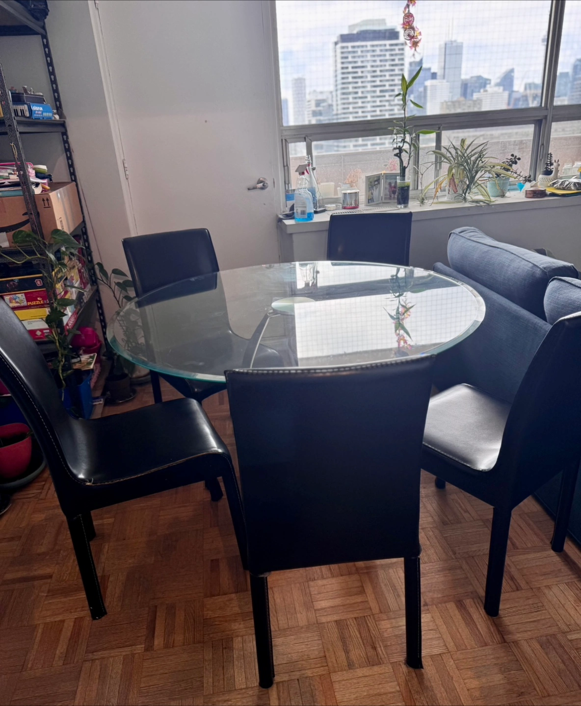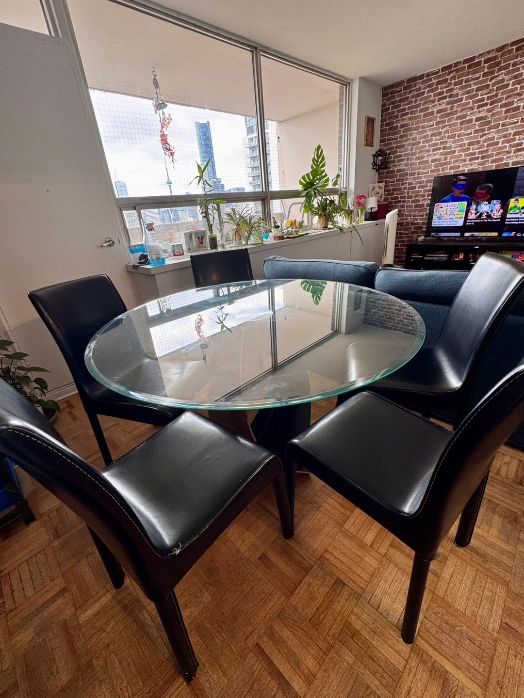 Table is in great shape, no cracks or chips in the glass. Easy to clean and fits well in condos or apartments.