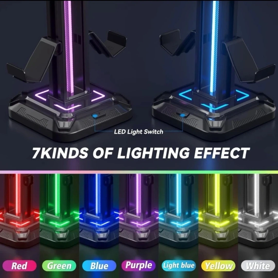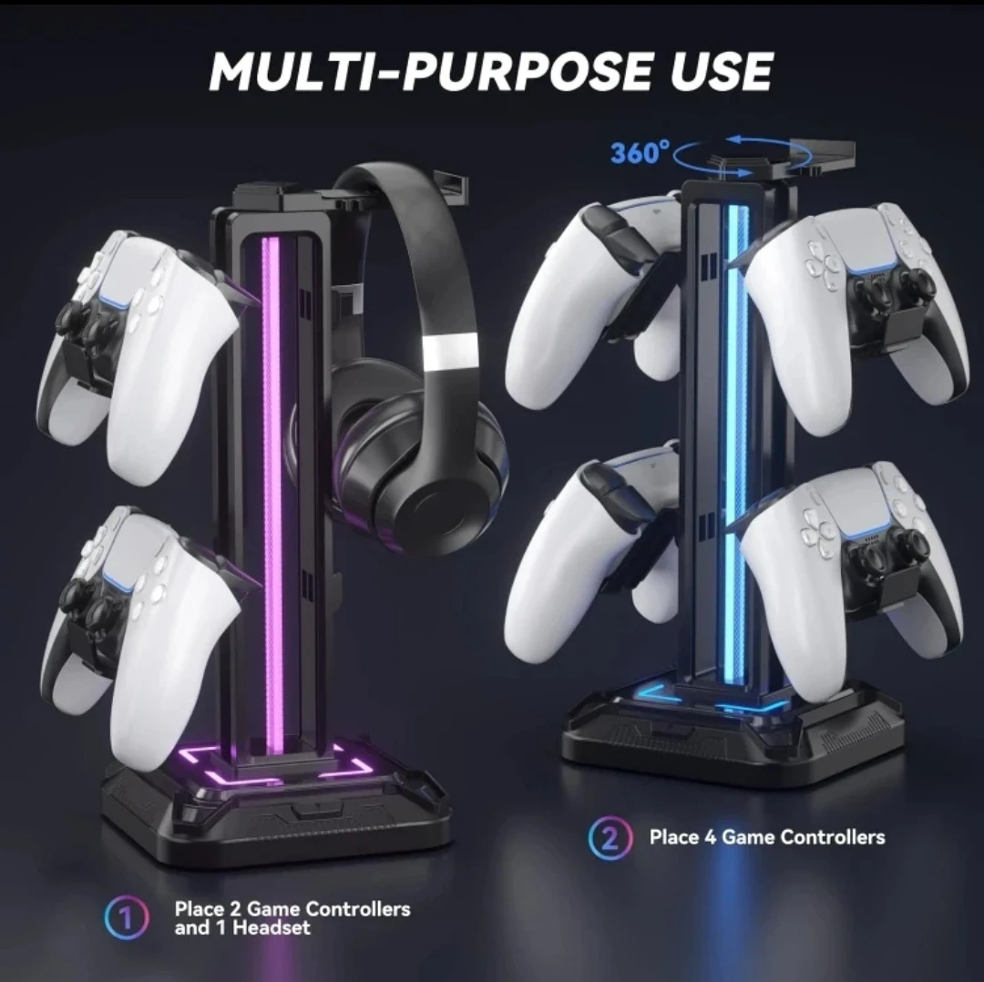 Elevate your gaming setup with this new KDD RGB headset and controller stand featuring nine different light modes, a rotating headset hanger, and a detachable controller hook, perfect for gamers on PC, Xbox, and PlayStation!