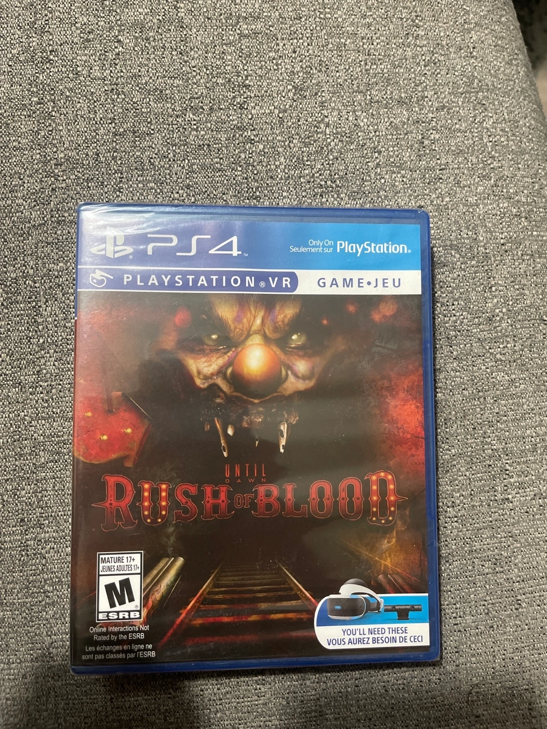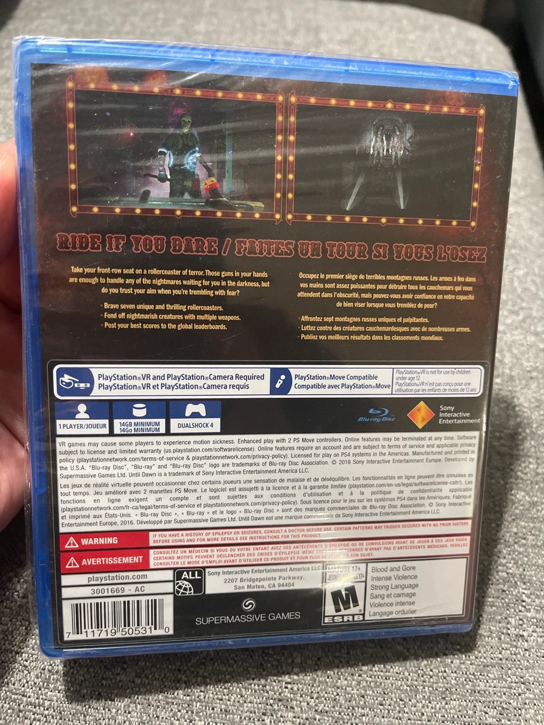 Selling Until Dawn: Rush of Blood for the PS4. It requires PlayStation VR and the PlayStation Camera. It's rated M for Mature 17+.