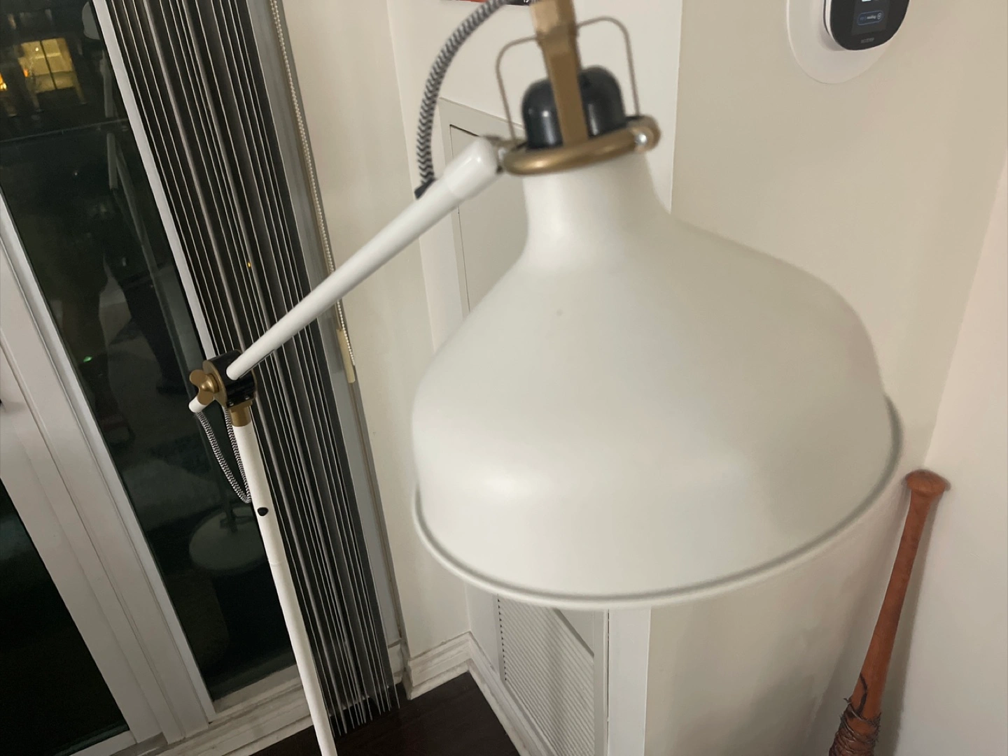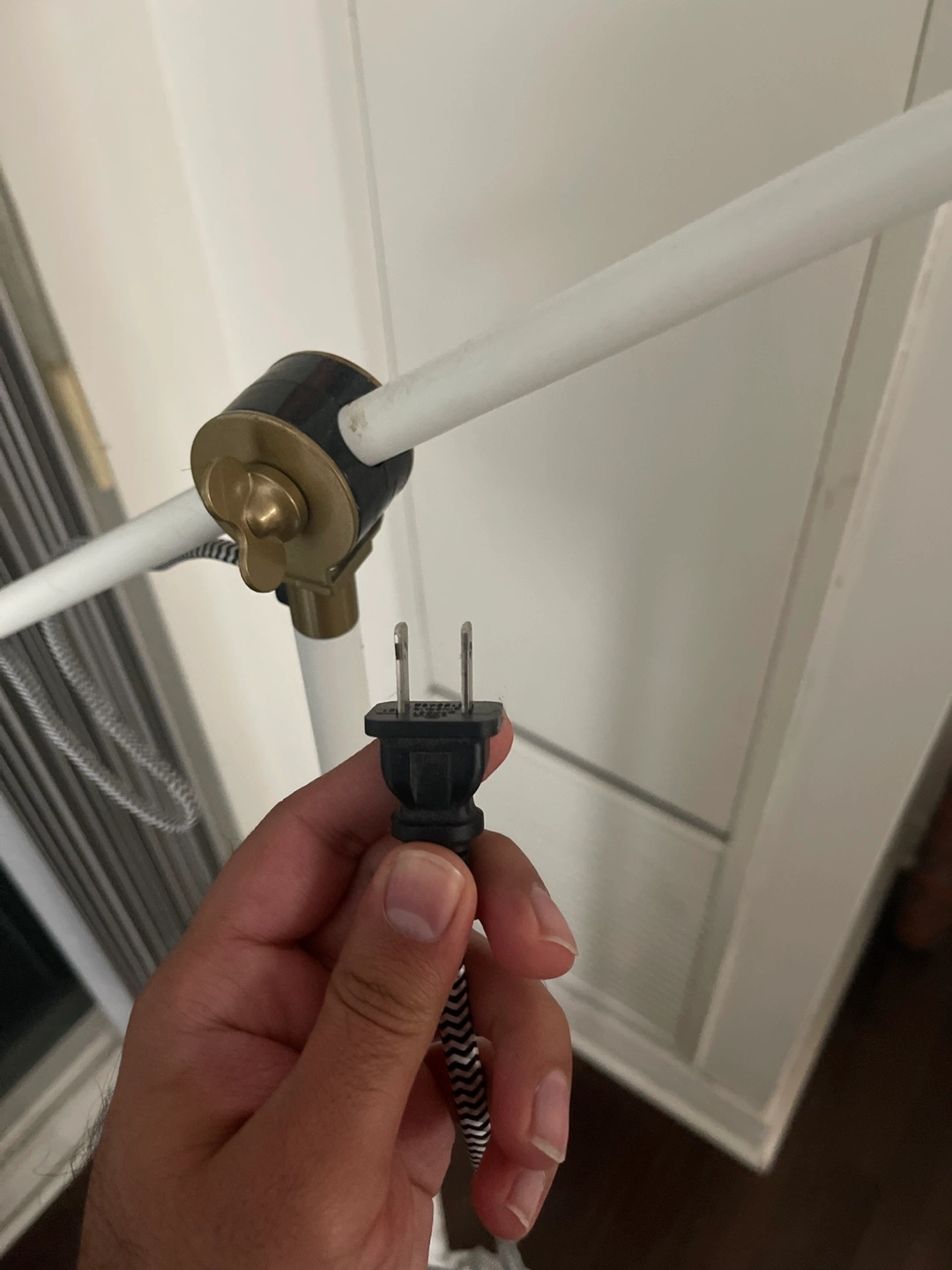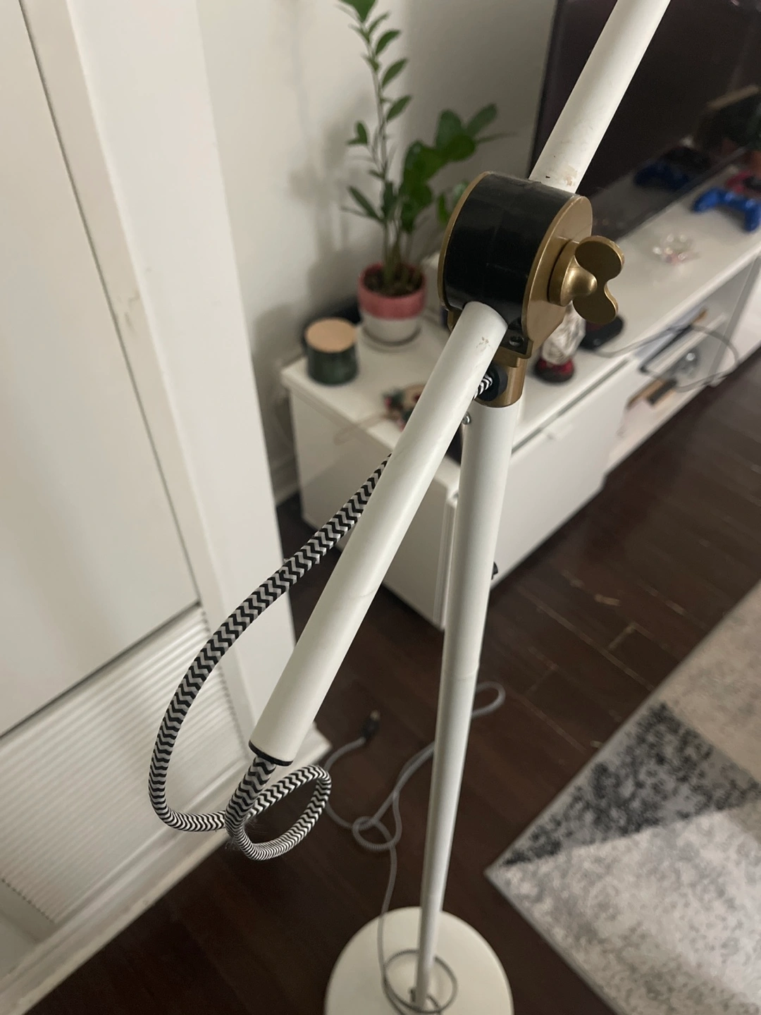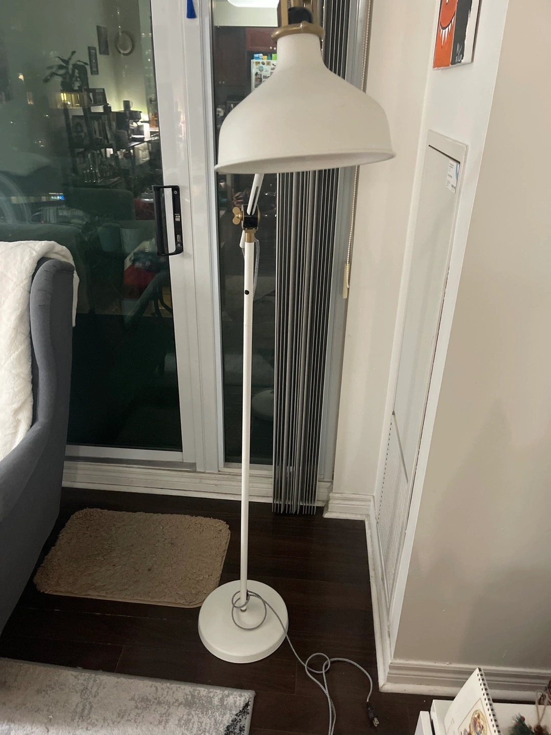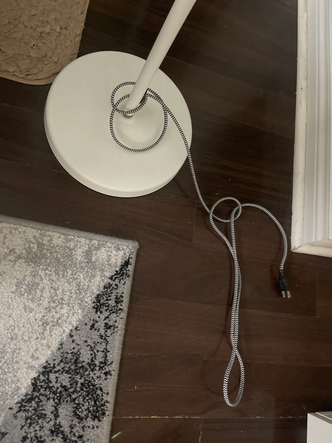 Selling a white floor lamp in great condition! It has a unique design with a white shade and a black and white patterned cord. It would look great in any room!