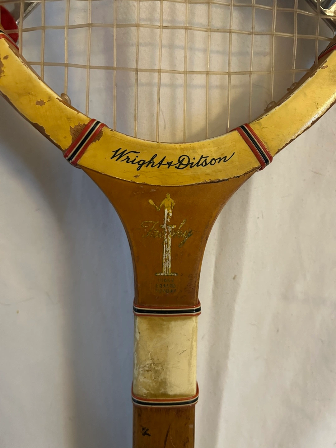 Selling a vintage WRIGHT & DITSON ‘Trophy’ Fibre Sealed Throat Wood tennis racquet. It shows some wear and tear, but it's a cool collectible piece of sports history!