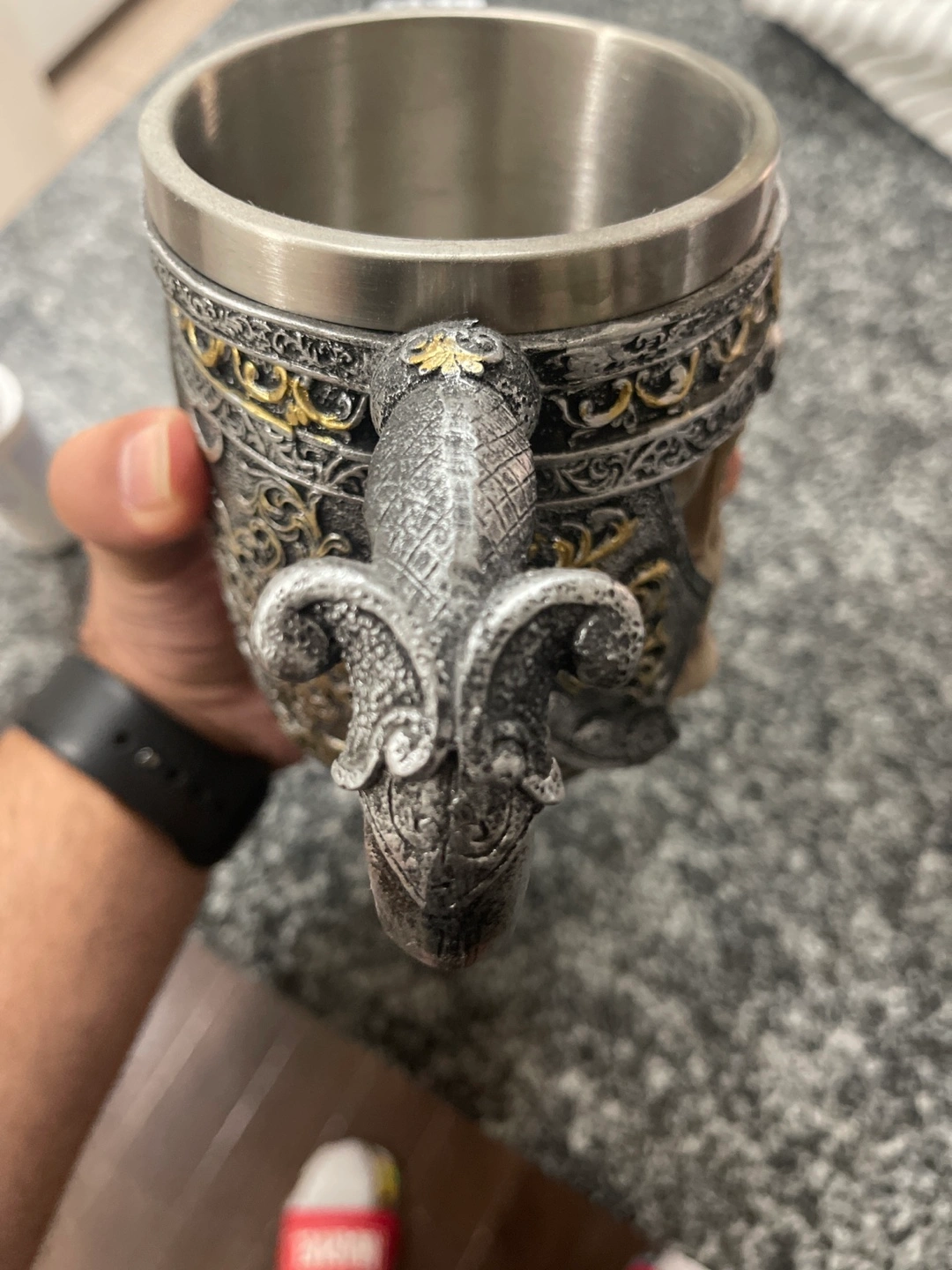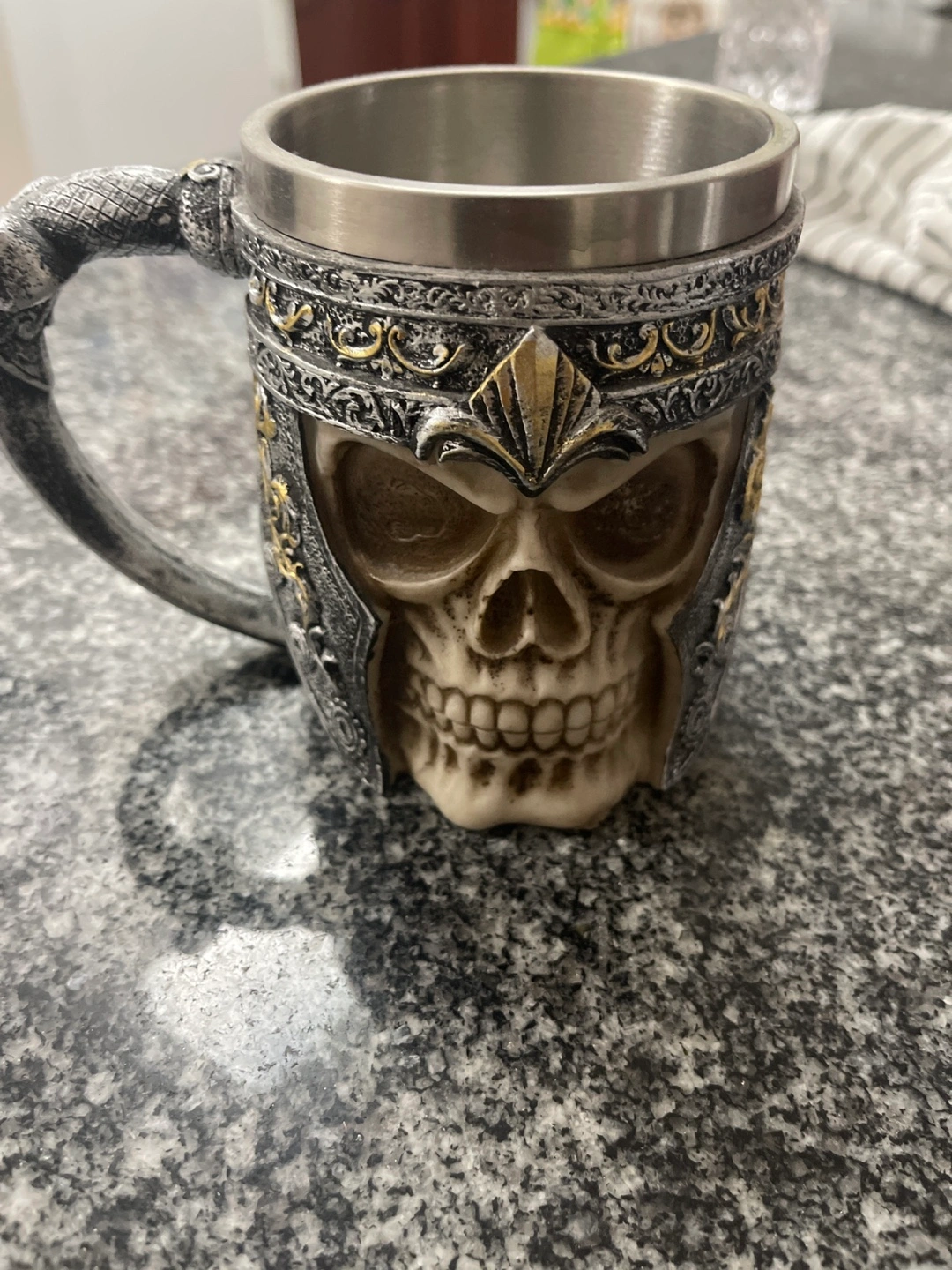 Cool skull mug with a detailed and ornate design! It's made of metal and resin, and it's in great condition. Perfect for adding a bit of gothic flair to your drinks!