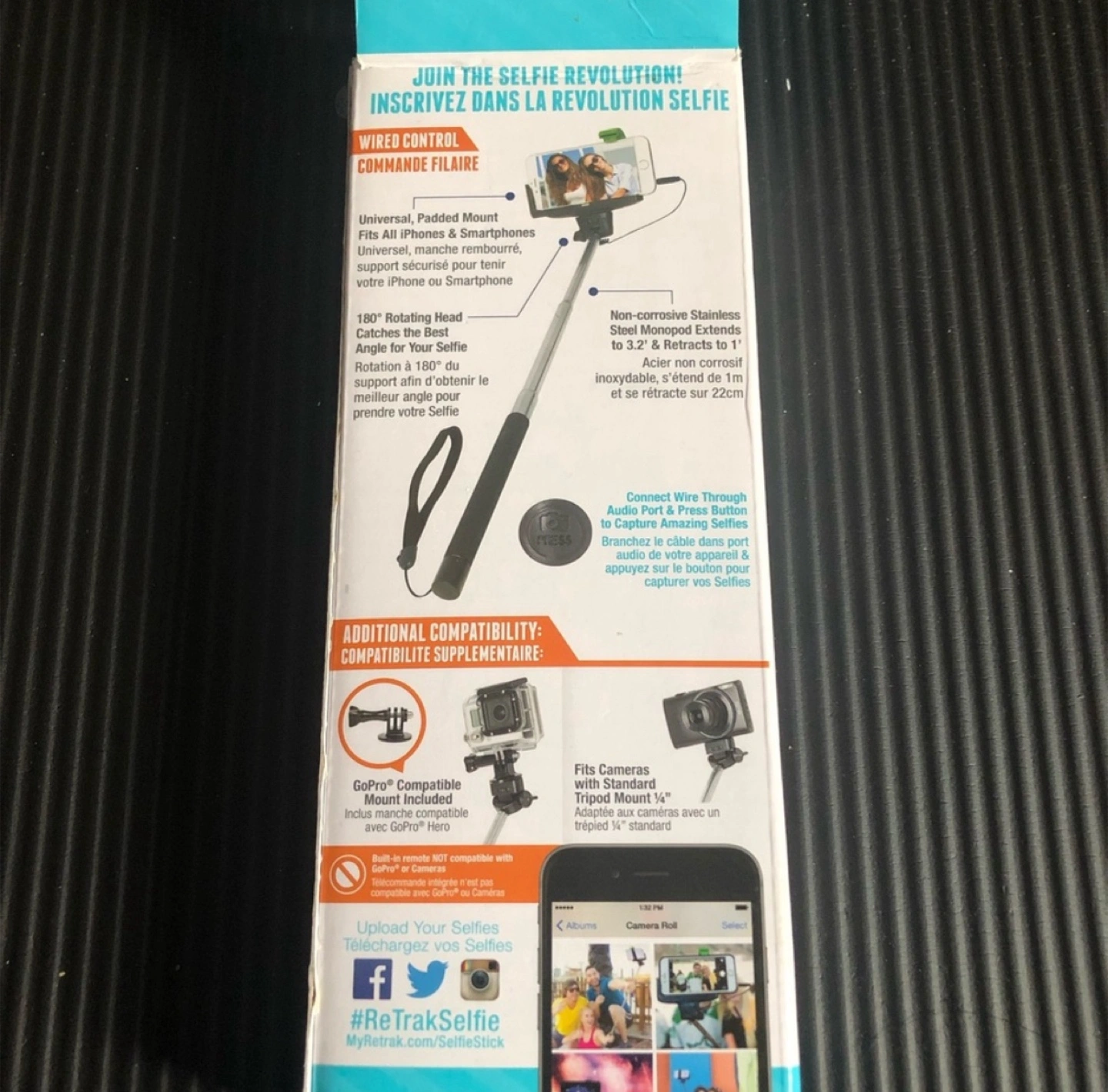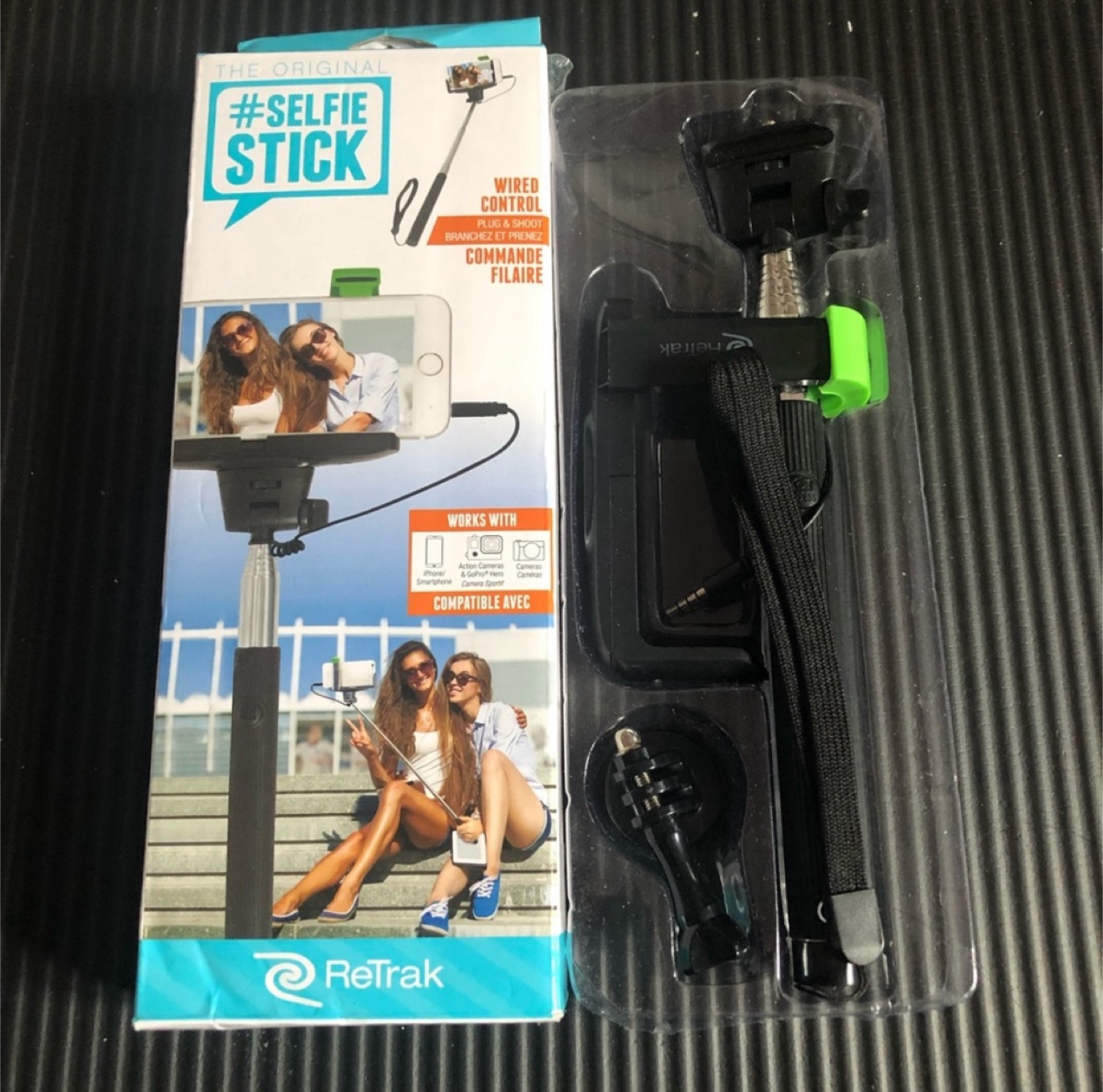 Selling a brand new ReTrak selfie stick! It comes with wired control for easy plug and shoot action. It's compatible with iPhones, smartphones, action cameras, and GoPro cameras. The stainless steel monopod extends to 3.2' and retracts to 1'. The box is included!