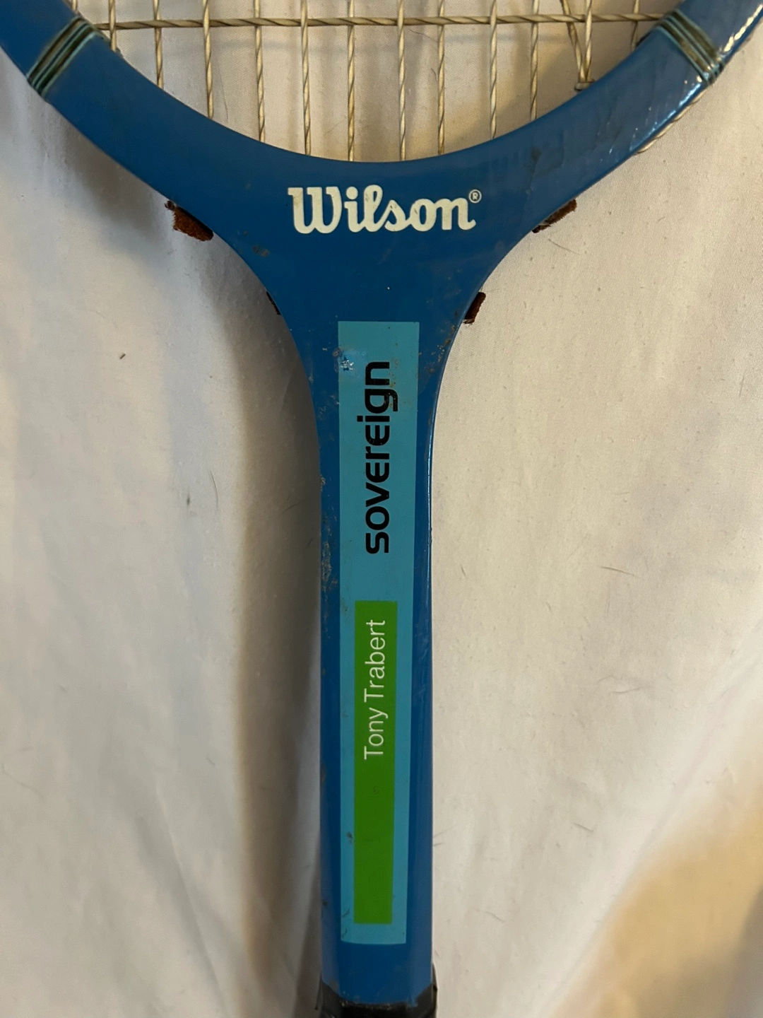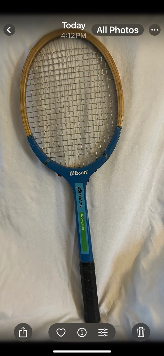 Selling a Wilson Sovereign Tony Trabert tennis racket. It's a blue and wooden racket showing some signs of wear, but still has a lot of life left in it for casual play or as a cool vintage collection piece or for display in a sports bar or tennis museum.