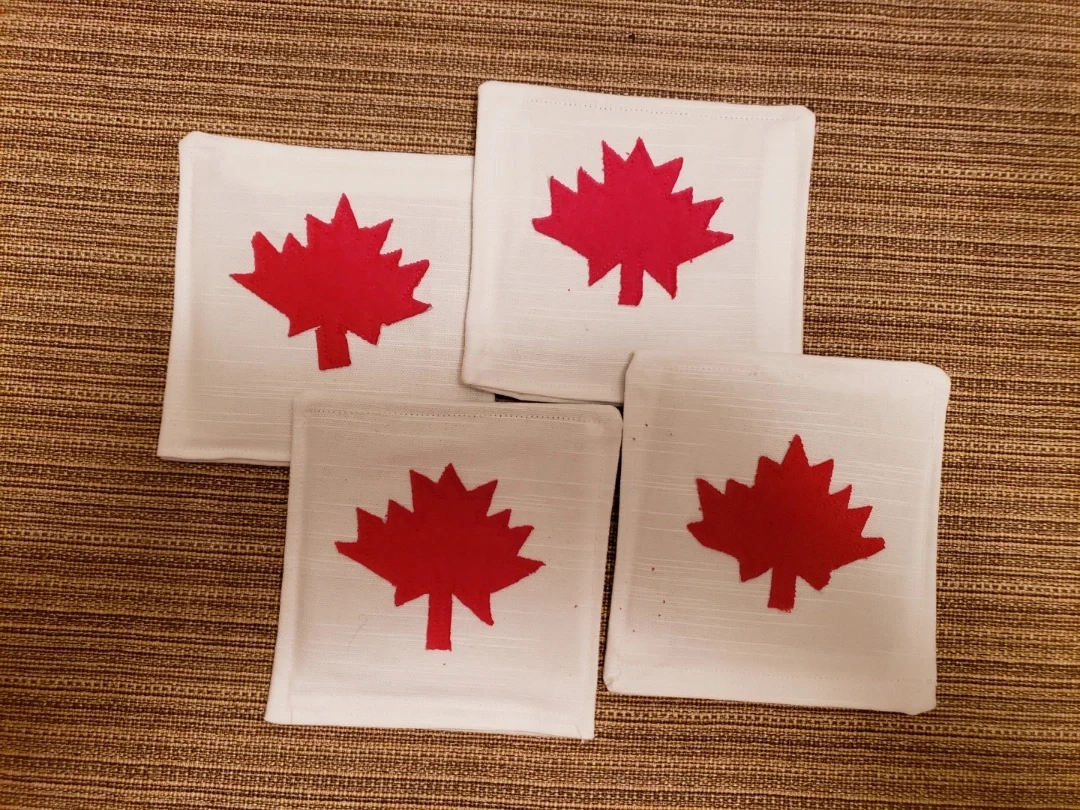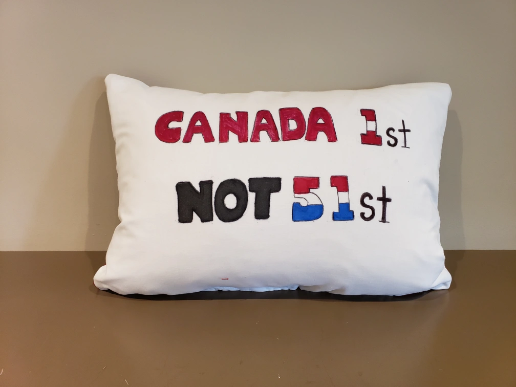 Celebrate your Canadian pride with a one of a kind decorative cushion! It features the iconic Canadian flag on one side and the phrase 'Canada 1st, Not 51st' design on the other. Perfect for Canada Day. Zippered. Bonus is a set of Maple leaf drink coasters.