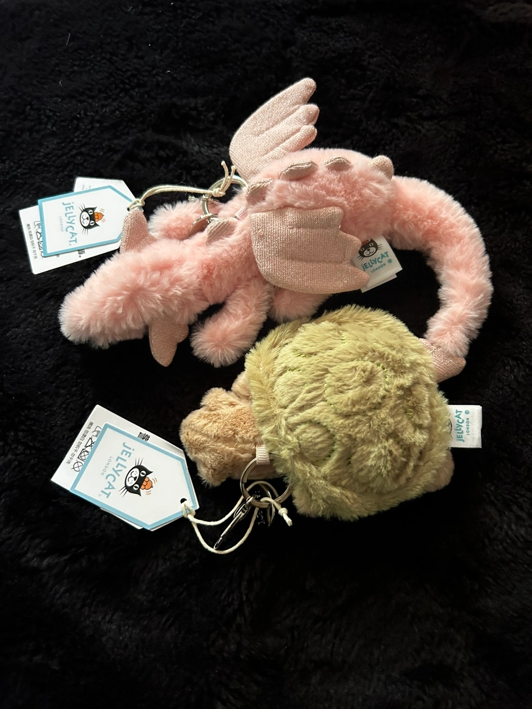 Two adorable Jellycat plush keychains up for grabs! One is a cute pink dragon and the other is a sweet little turtle. Both are in great condition and ready to add some charm to your keys or bag