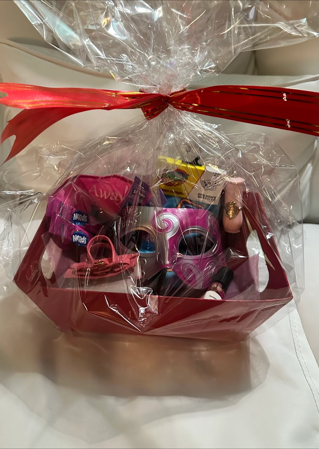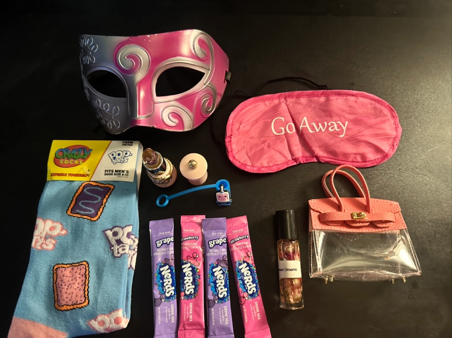 I'm selling a fun gift set that includes 1 pink and silver mask, 1 pair of Pop-Tarts themed Socks, 4 Nerds candy juice packs in grape and strawberry flavors, 1 pink "Go Away" sleep mask, 1 mini Clear & Pink purse,1 color changing lipstick with a purple flower, 1 essential oil, 1 reusable straw cover.