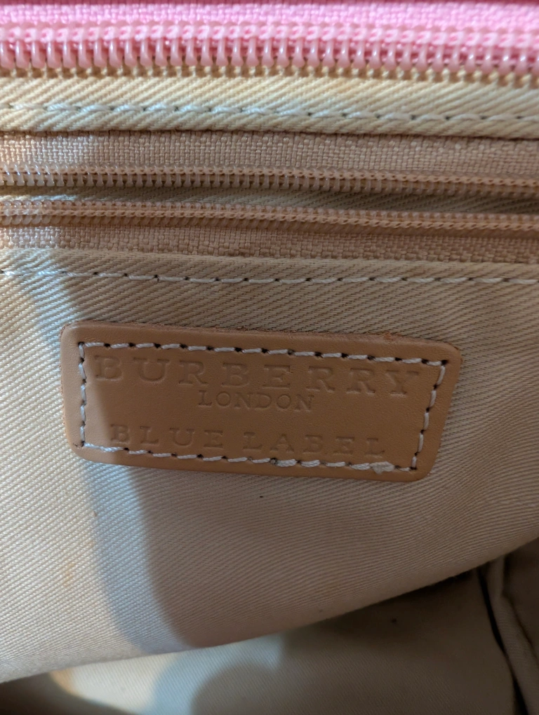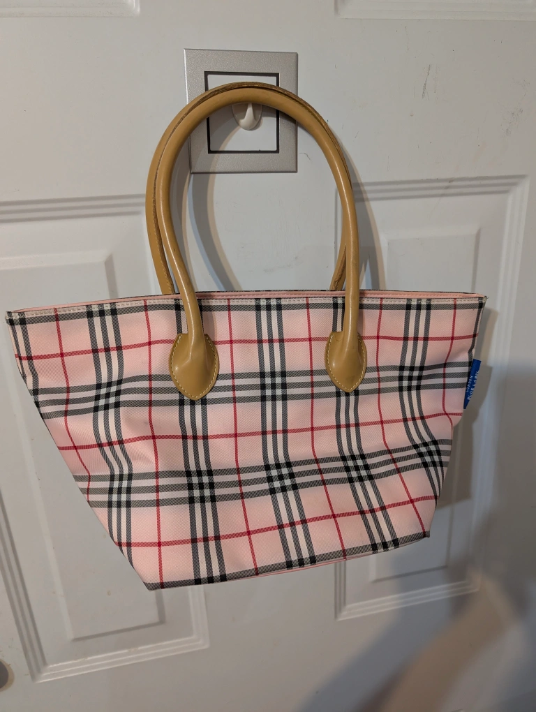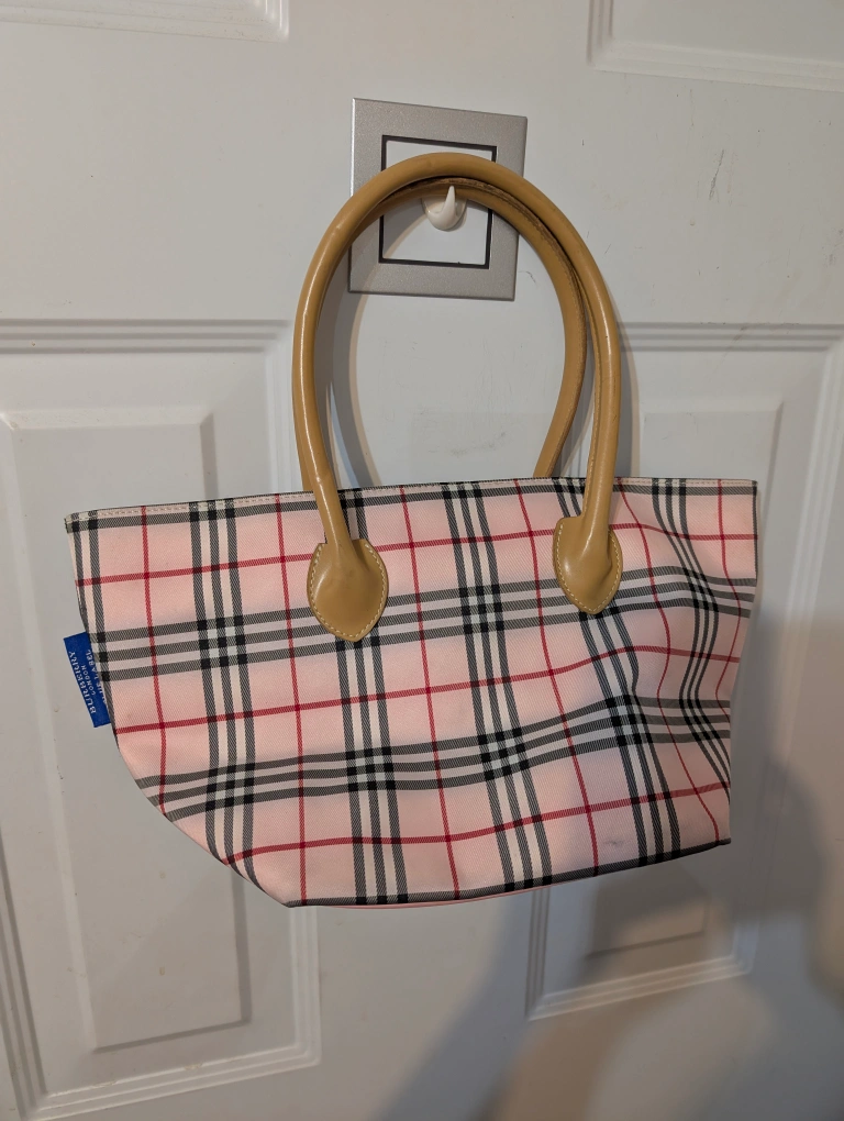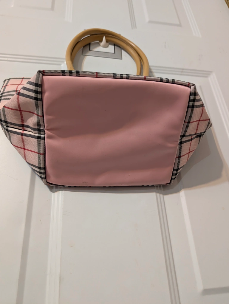 Here's a cute Burberry Blue Label tote bag! It features a pink plaid pattern and light brown handles.