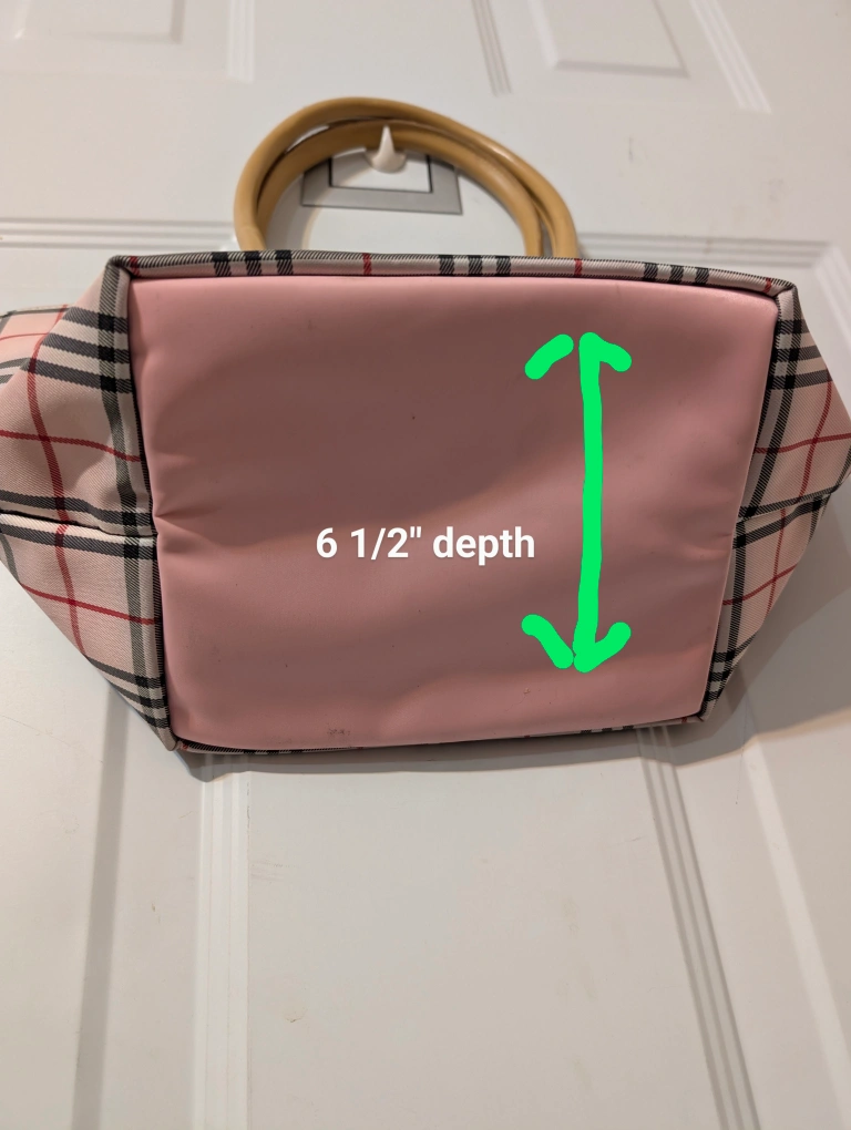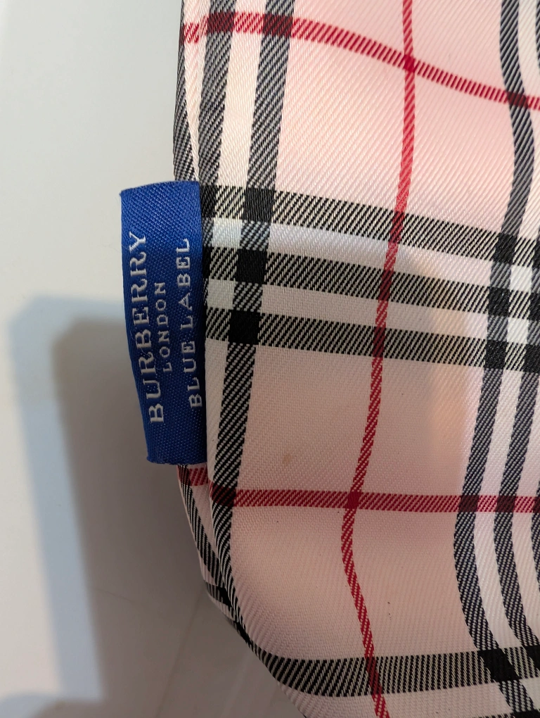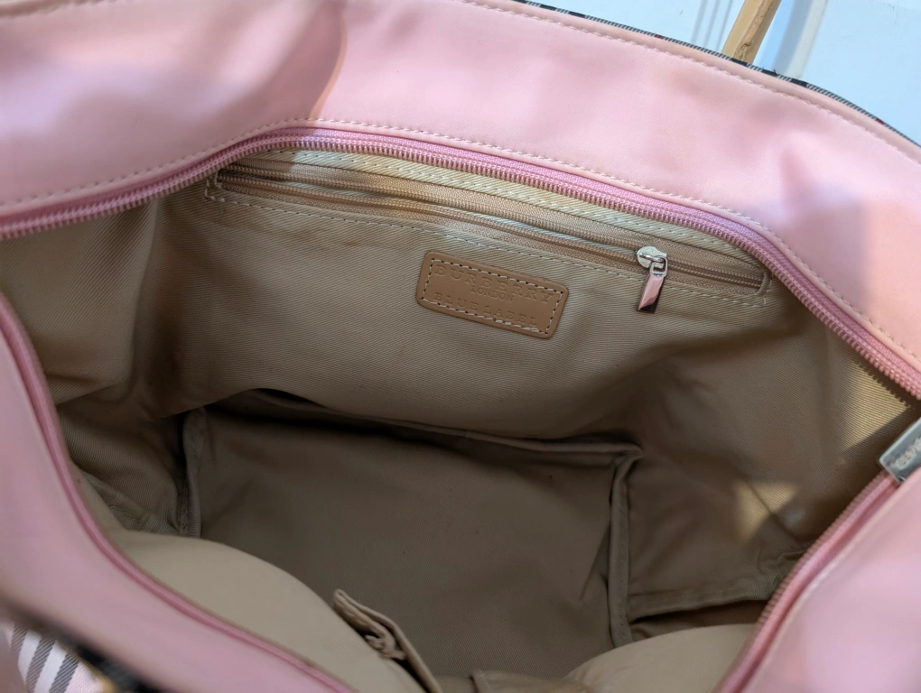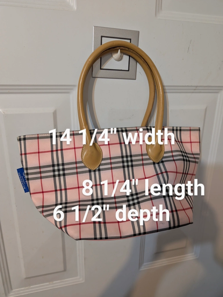 Here's a cute Burberry Blue Label tote bag! It features a pink plaid pattern and light brown handles.