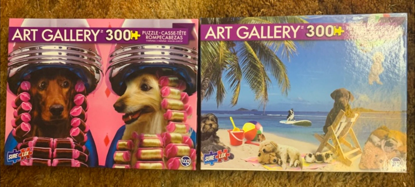 Two fun Art Gallery 300+ piece puzzles! One has dogs at the beach and the other has dogs in a salon. Price is for BOTH. puzzles.
