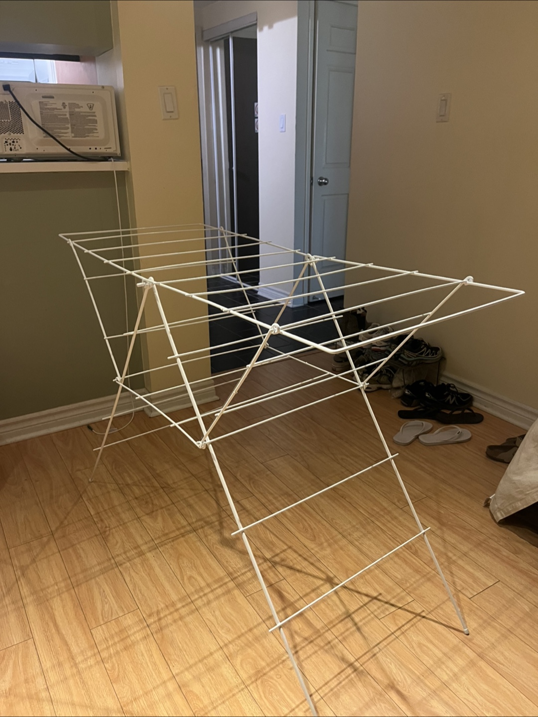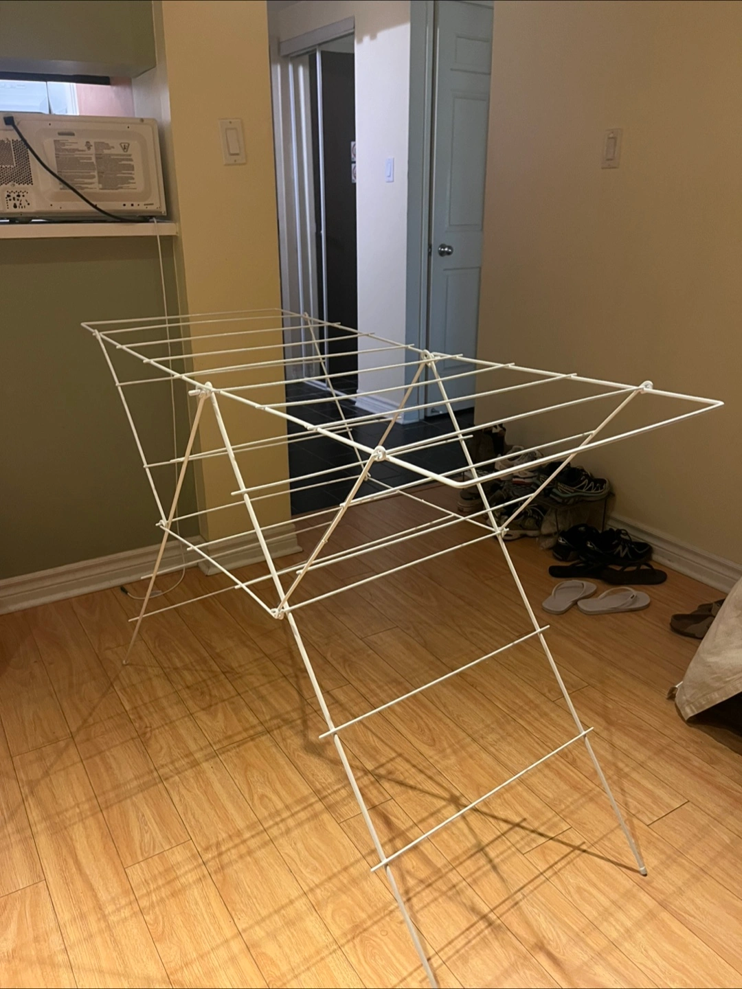 Selling a collapsable clothes drying rack. It's in great condition and ready to help you save on dryer costs! Perfect for apartments or homes where space is a premium. Approximately 4 feet tall and 3 feet wide (when fully expanded).