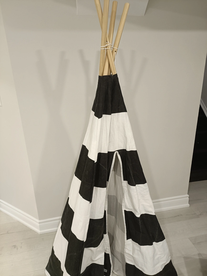 Selling a cute teepee tent for kids! It features a stylish black and white striped design and wooden poles. Perfect for indoor play and creating a cozy space for your little ones about 6ft tall