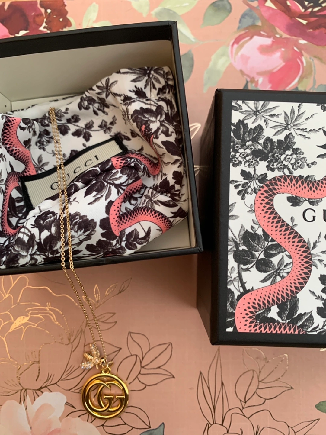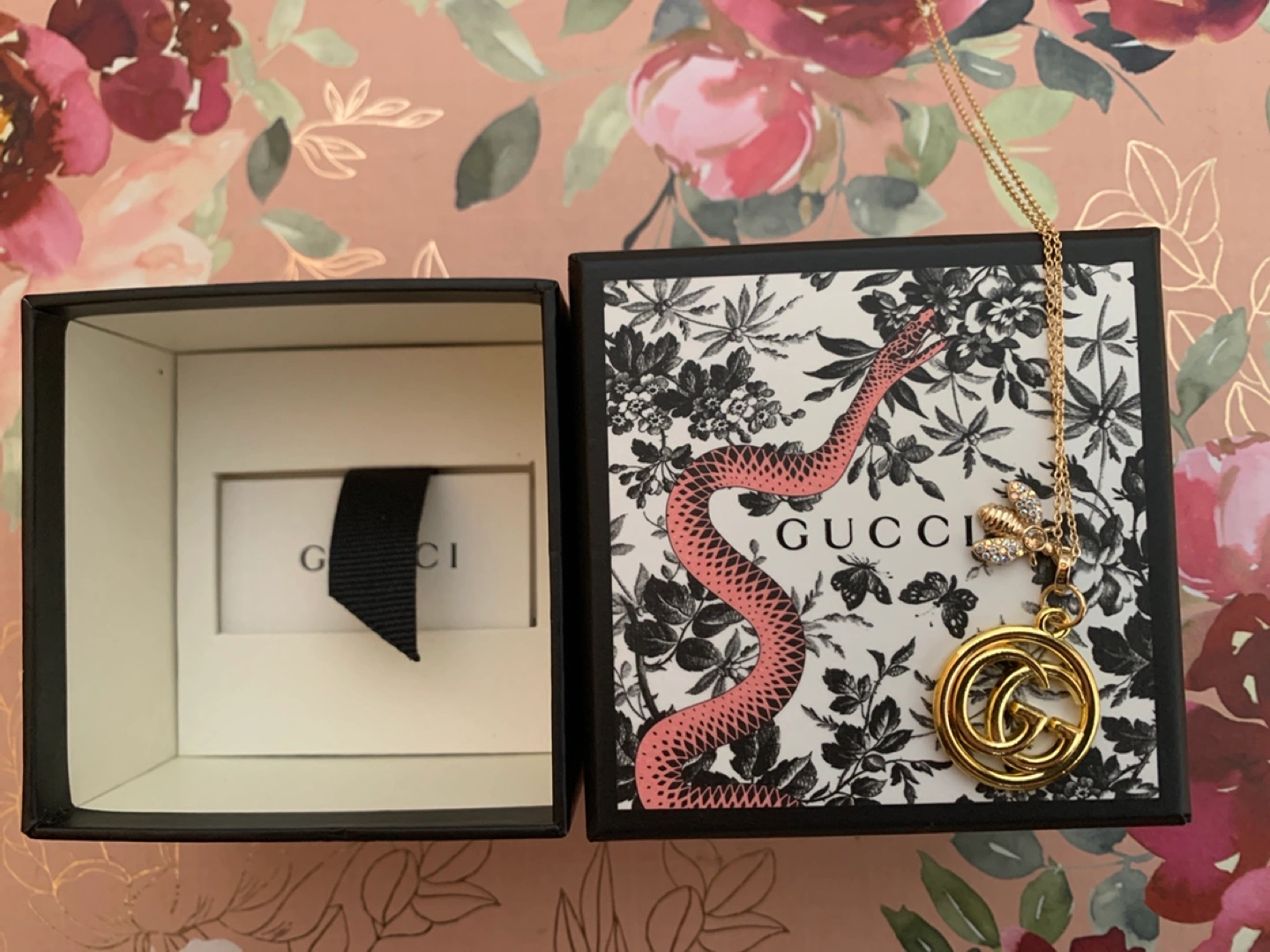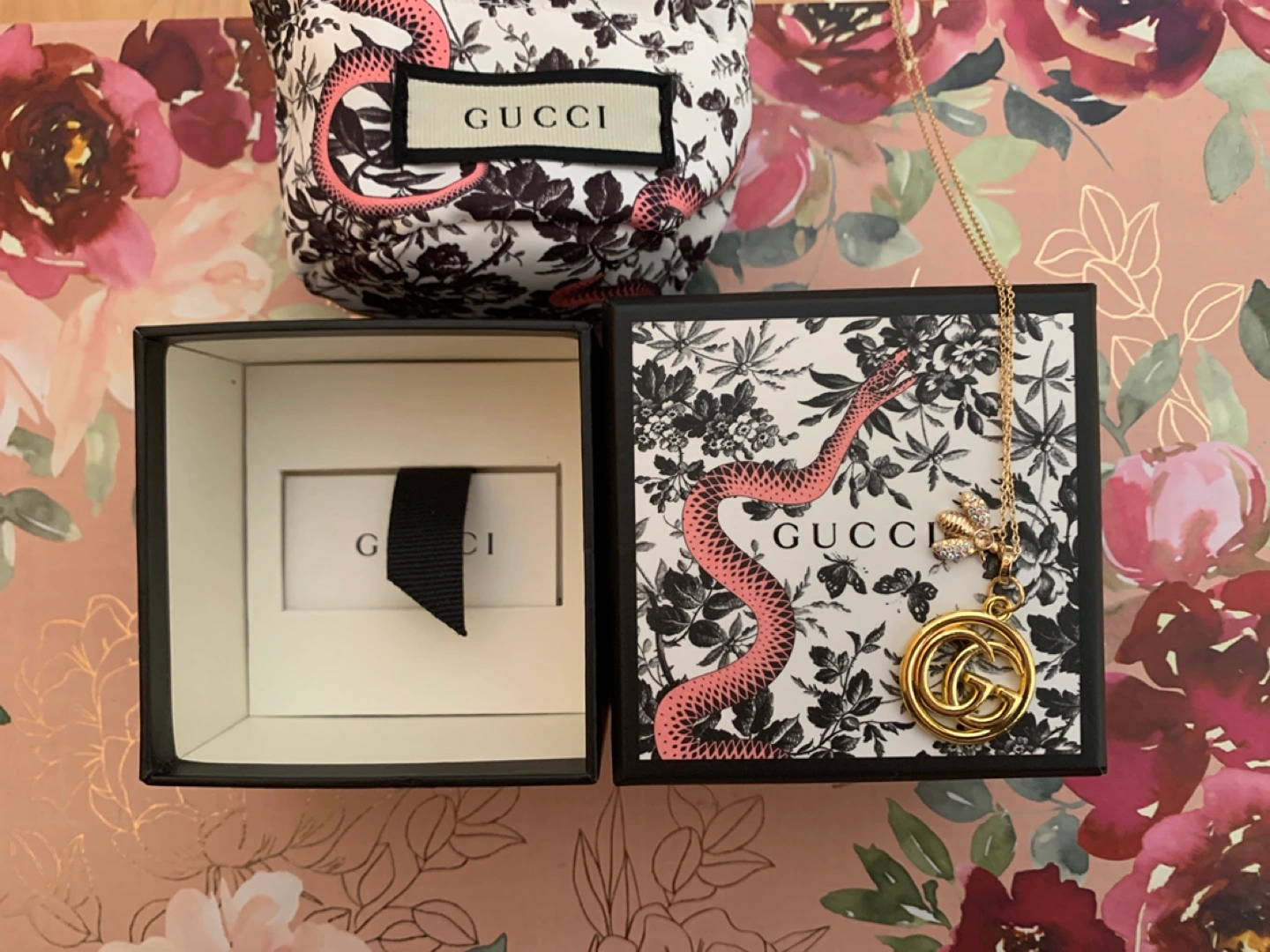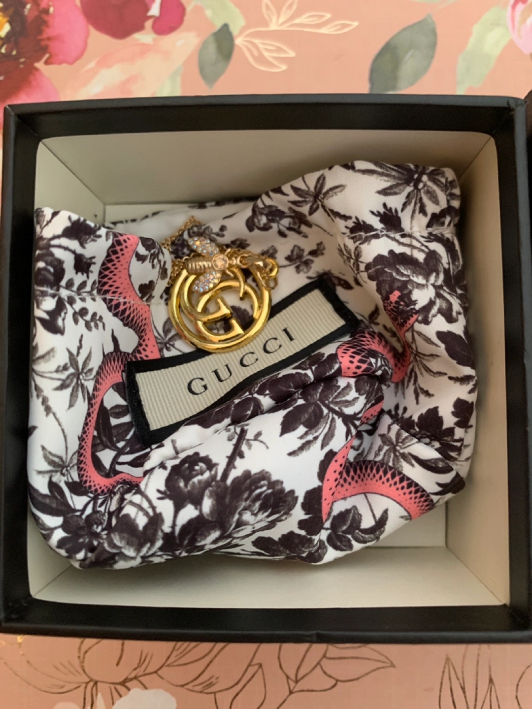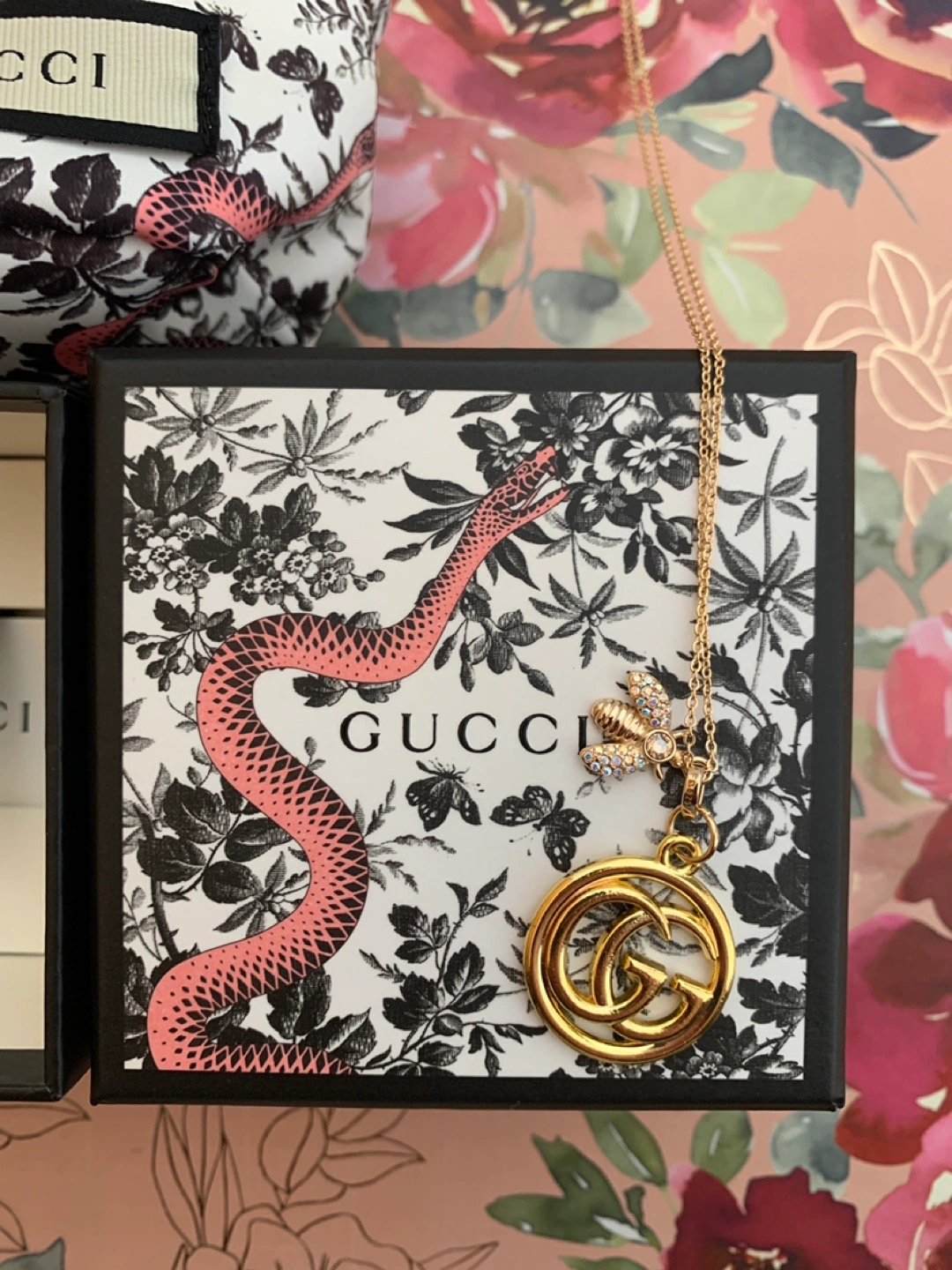 Selling a beautiful Gucci necklace featuring a bee and the iconic GG pendant. It comes with its original box and packaging, ready to be gifted or enjoyed. It's in excellent condition!