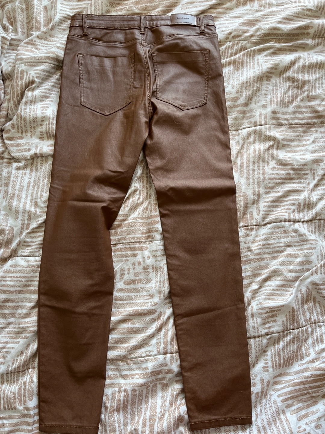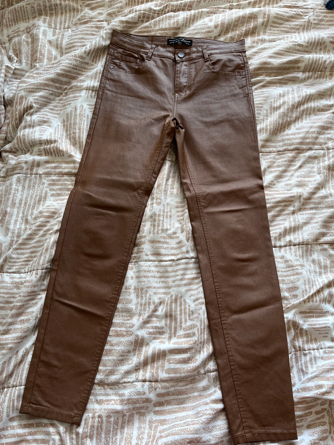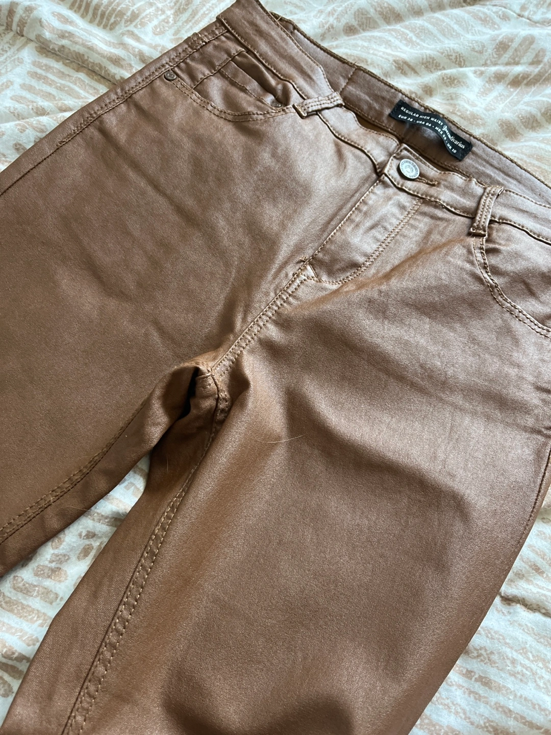 These pants are a stylish addition to any wardrobe! They feature a regular high waist and are a size 6. The pants are in great condition and ready for a new home. Leather style
