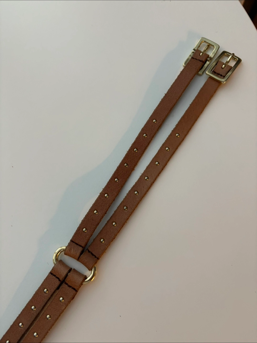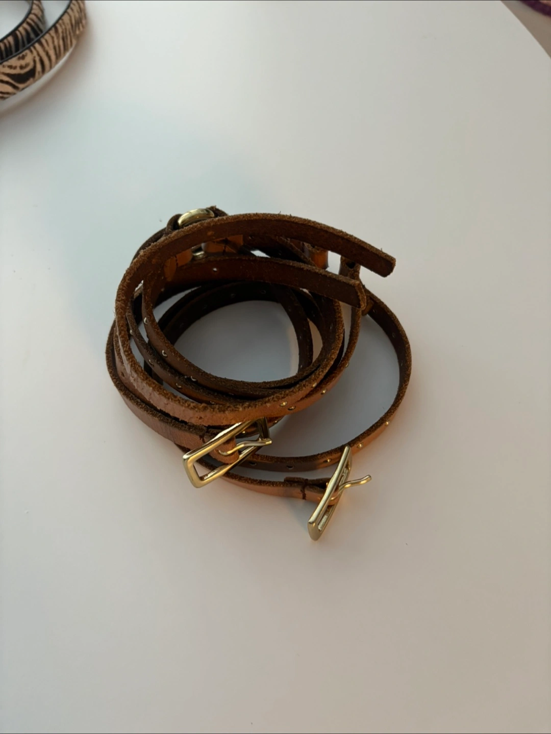 One is a brown leather belt with gold hardware and studded detailing. The other is a zebra print belt with silver hardware.
