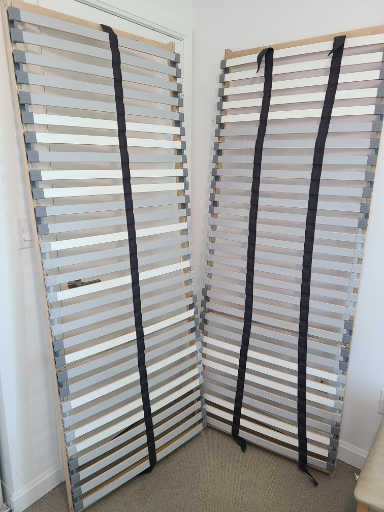 Changed out our mattress. These are sprung bed slats measuring 79" x 30" we put them directly on our old IKEA wood slats in a queen size bed frame and together they fit perfectly. Not sure why 1 bed slat had 1 strap and the other 2. Note that they do require a central support beam.