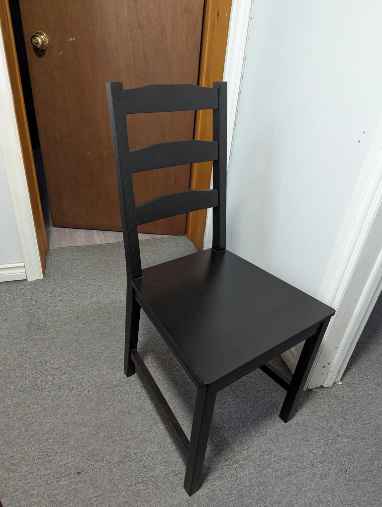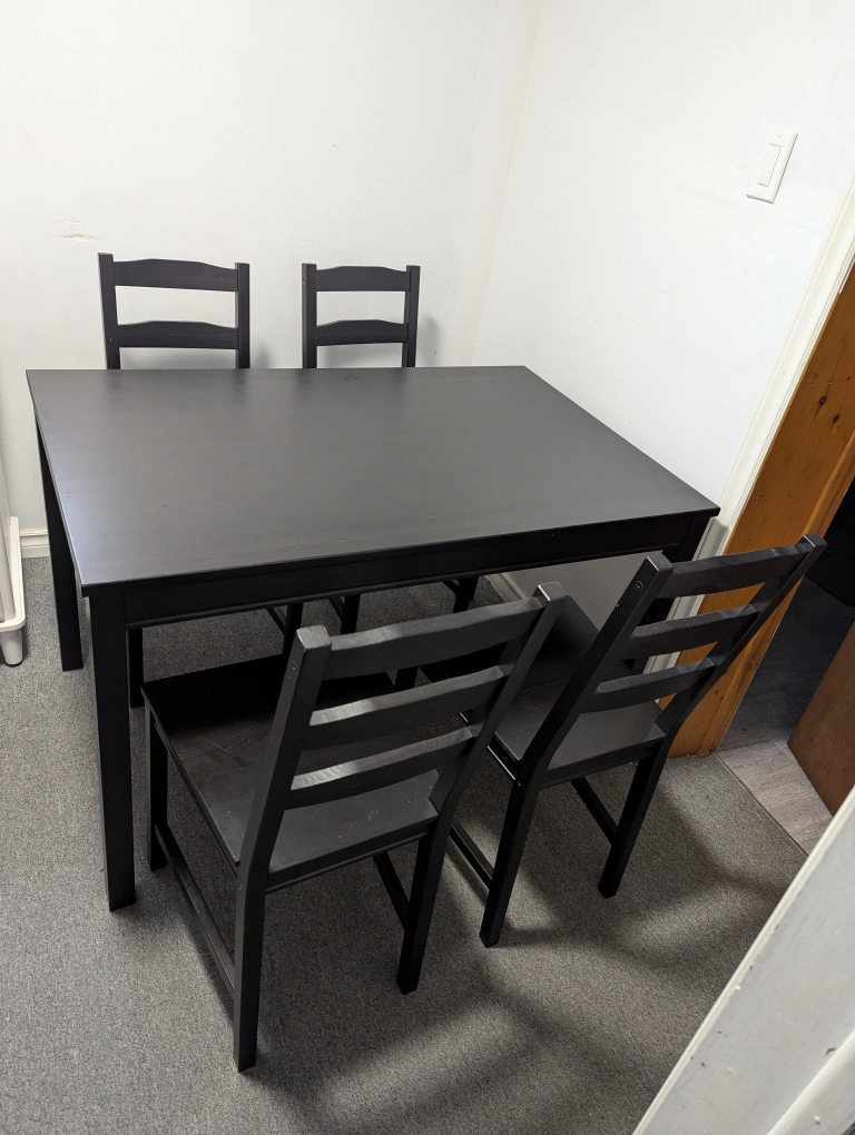 Selling a black dining table with four matching chairs. It's a simple and sturdy set, perfect for a small dining area or kitchen. The table and chairs are in good condition and ready for a new home!
