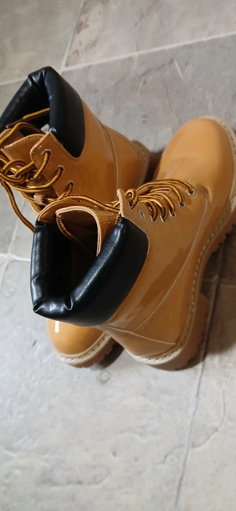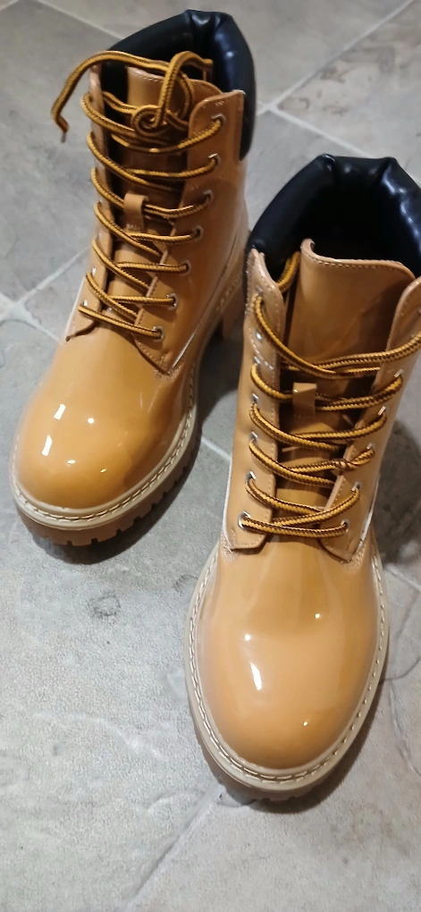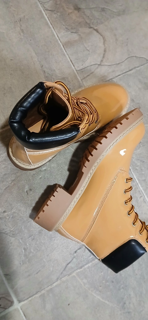Selling a pair of tan ankle boots. Bought from FashionNova, bigger for me. Size 6.5 They feature black padded collars and lace-up closures. Never worn, box and receipt of purchase intact! Perfect for adding a stylish touch to any outfit!
