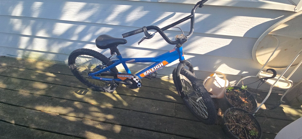 Selling a blue Raleigh Adrenaline BMX bike. It's in used condition, break is located on the pedal.