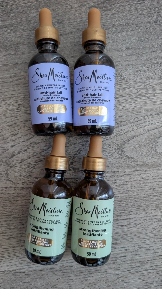 I have some Shea Moisture hair oil for sale. Each bottle contains 59 mL of product. There are two types available: