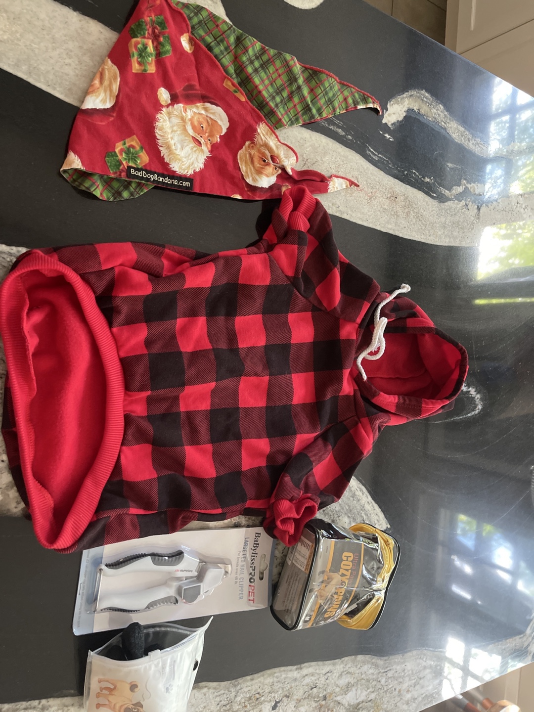 Selling a few items for your furry friend! There's a cute Bad Dog Bandana with a Santa print, a red and black buffalo plaid hoodie, and a Babyliss Pro Pet Large Animal Nail Clipper