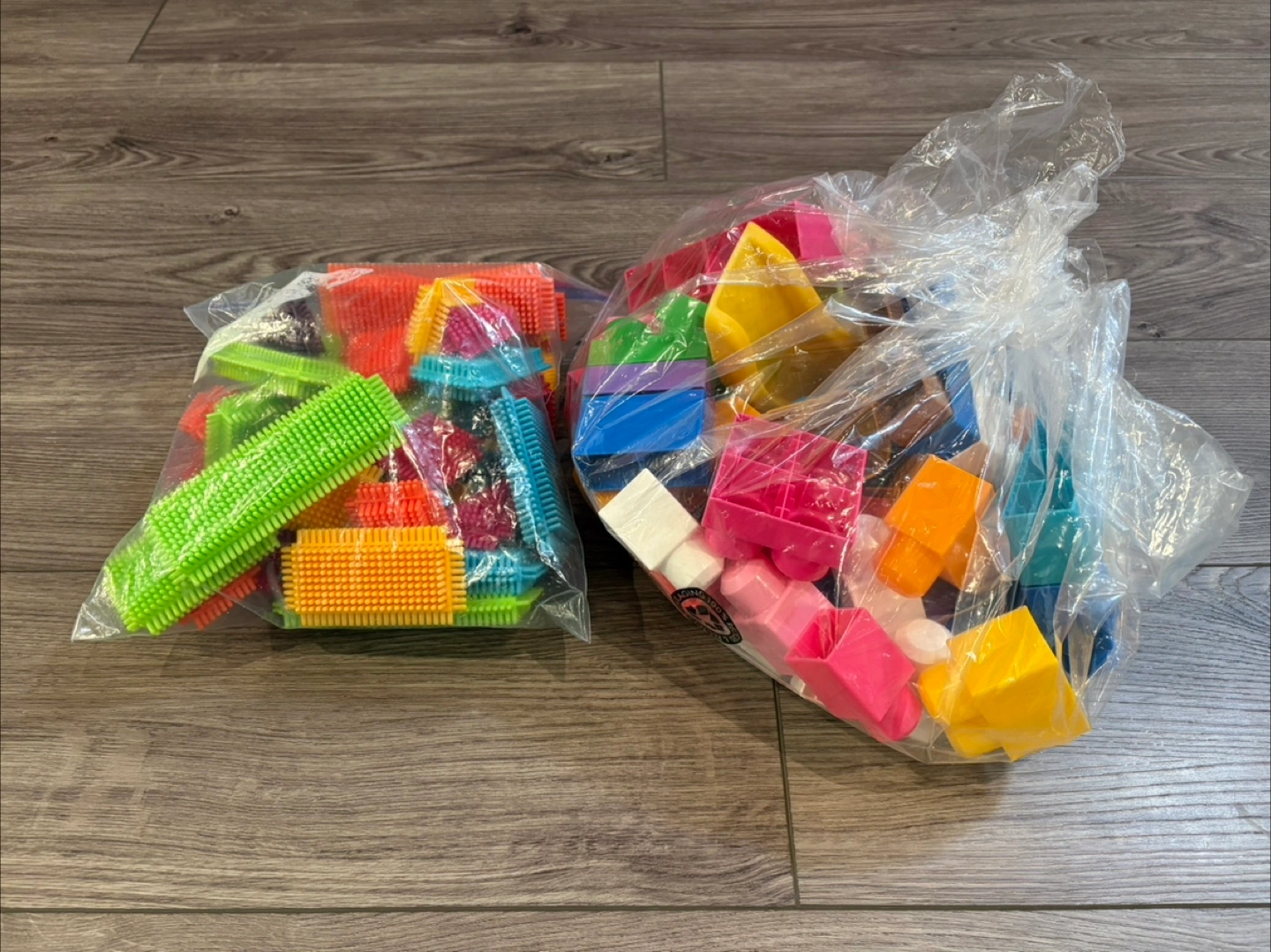 Two bags of colourful building blocks for kids! One bag contains blocks with soft, spiky textures, the other bag has Mega Bloks. Perfect for creative play and building fun.