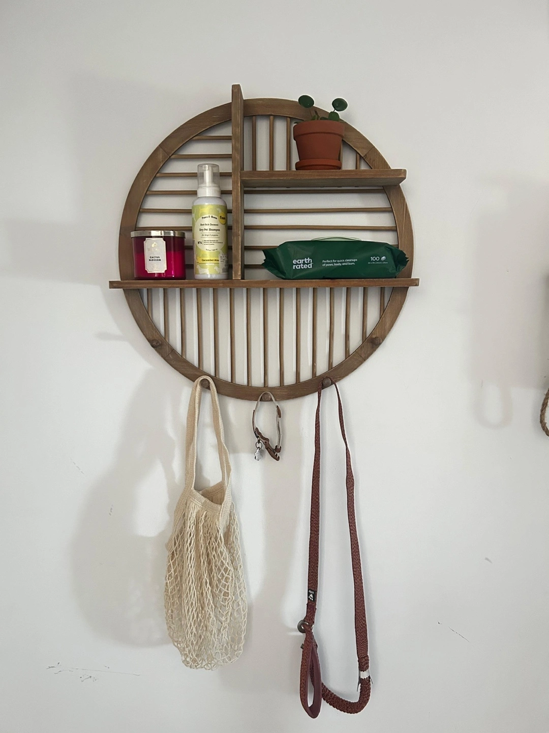 Selling a lovely round wooden wall shelf! It features a unique design with horizontal slats and two shelves for displaying your favourite items. There are also hooks at the bottom, perfect for hanging keys, dog leashes, or small bags. It's a great way to add some rustic charm to your home decor