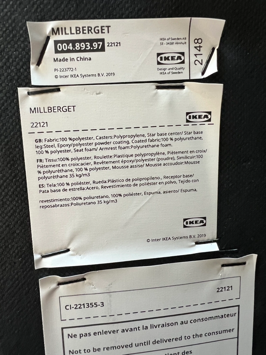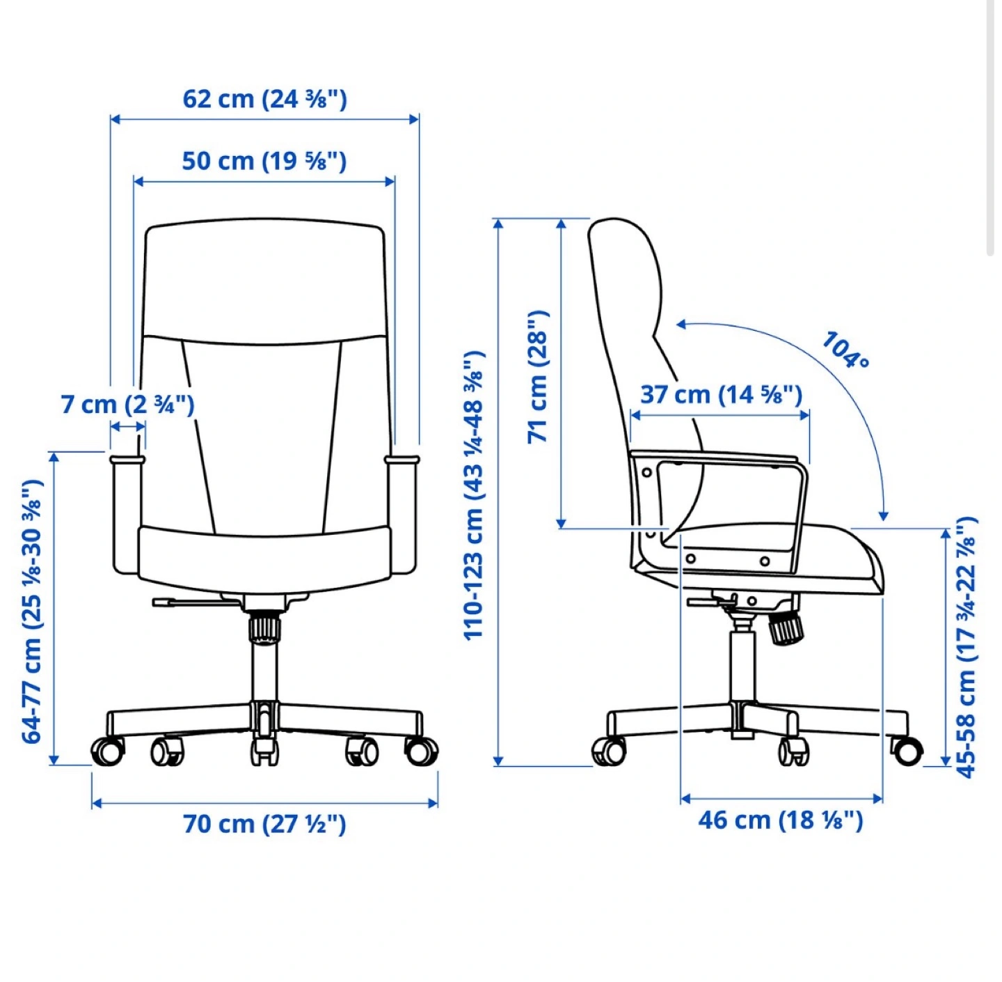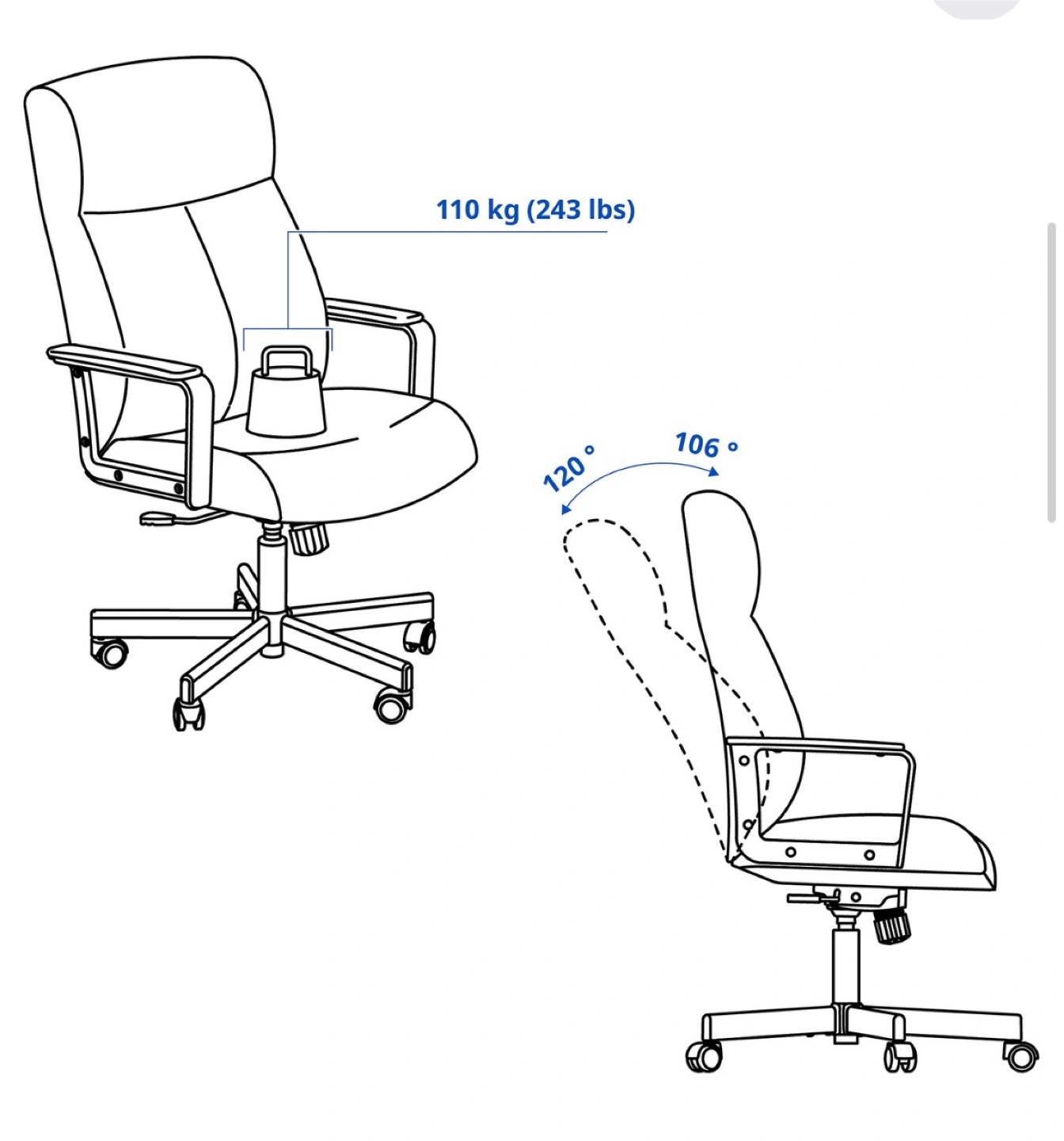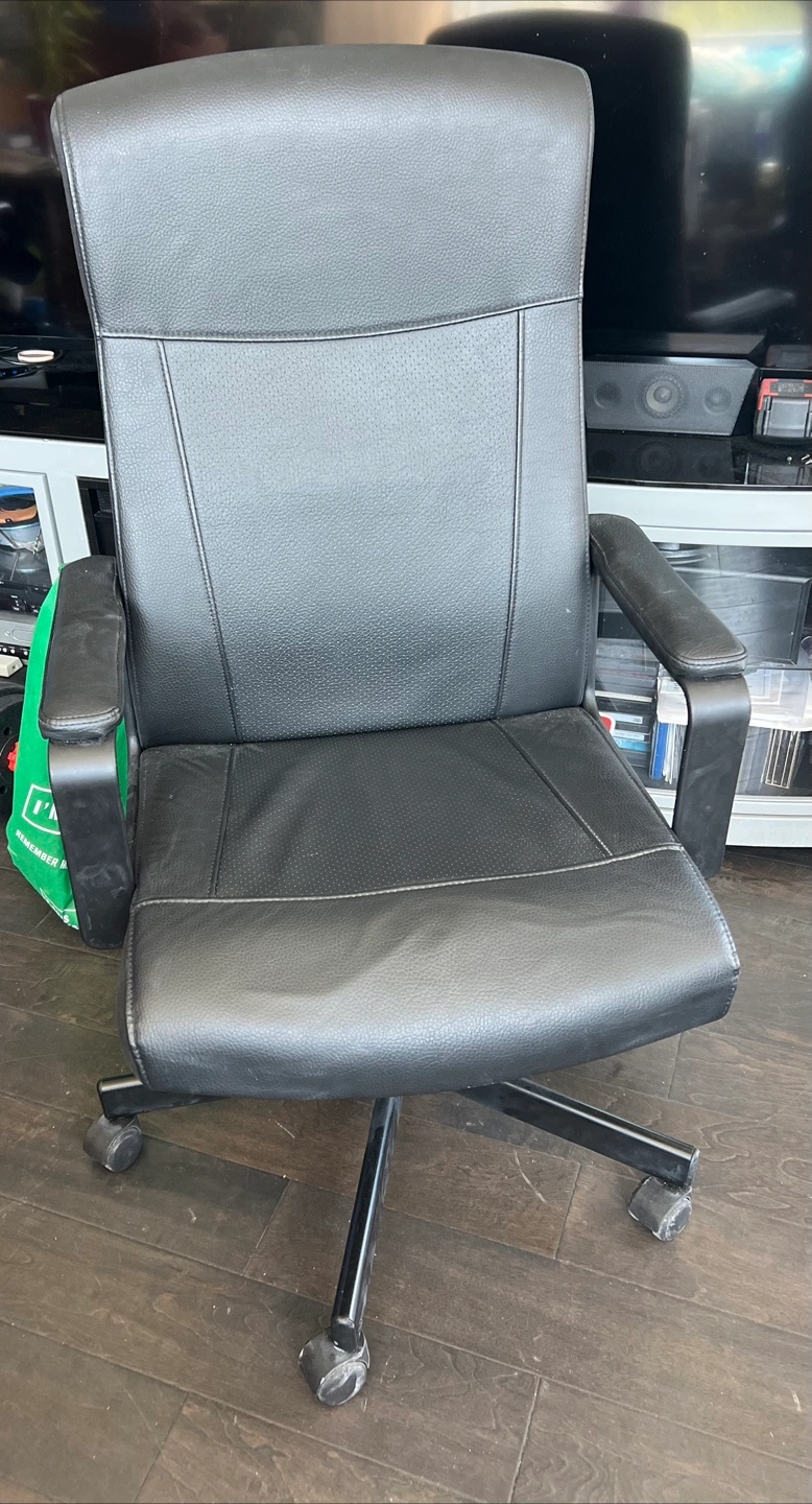 IKEA chair in very good shape no rips/tears. It swivel and rolls np. Only issue chair does not allow for height adjustment, other then that it’s perfect chair