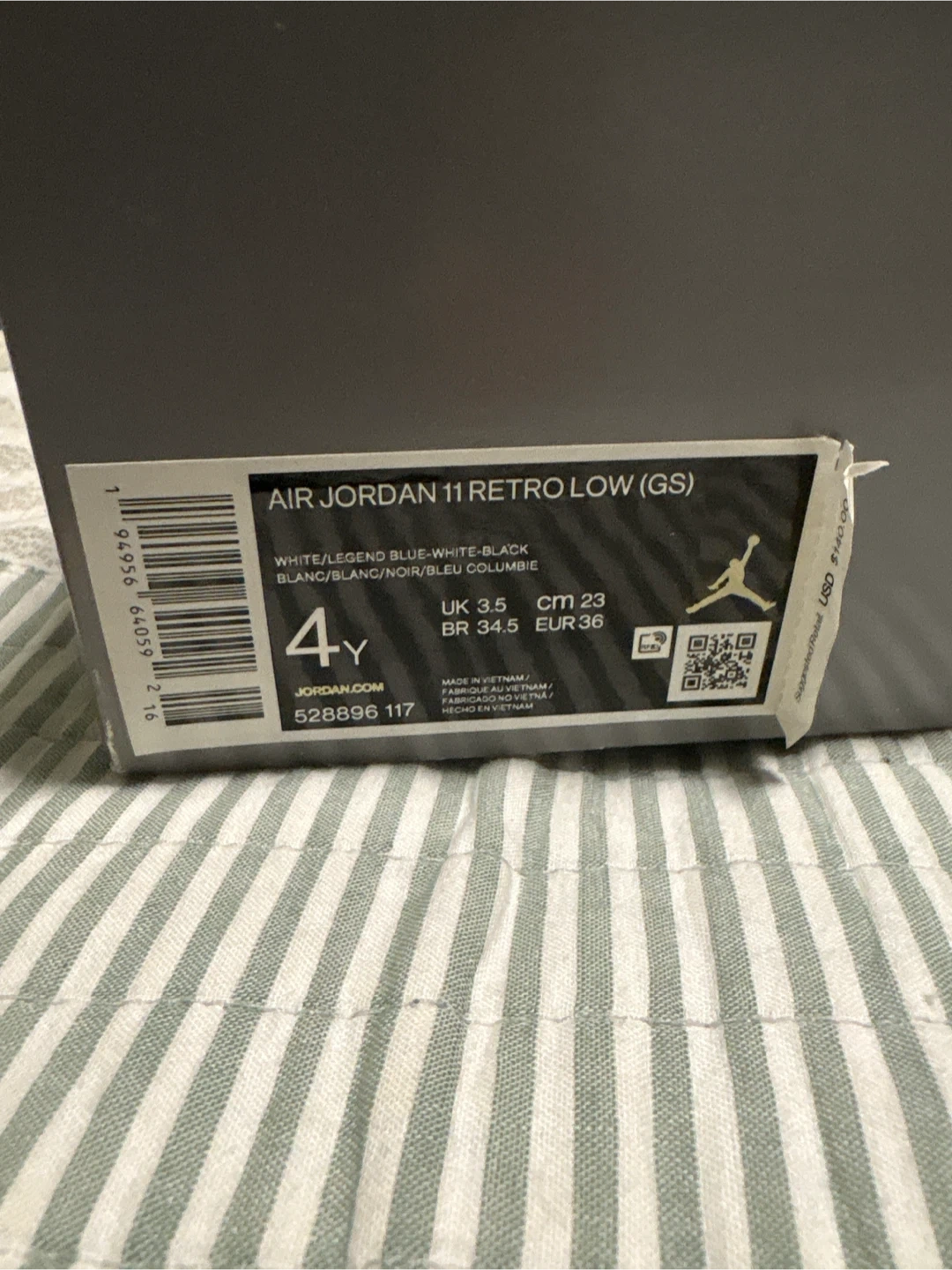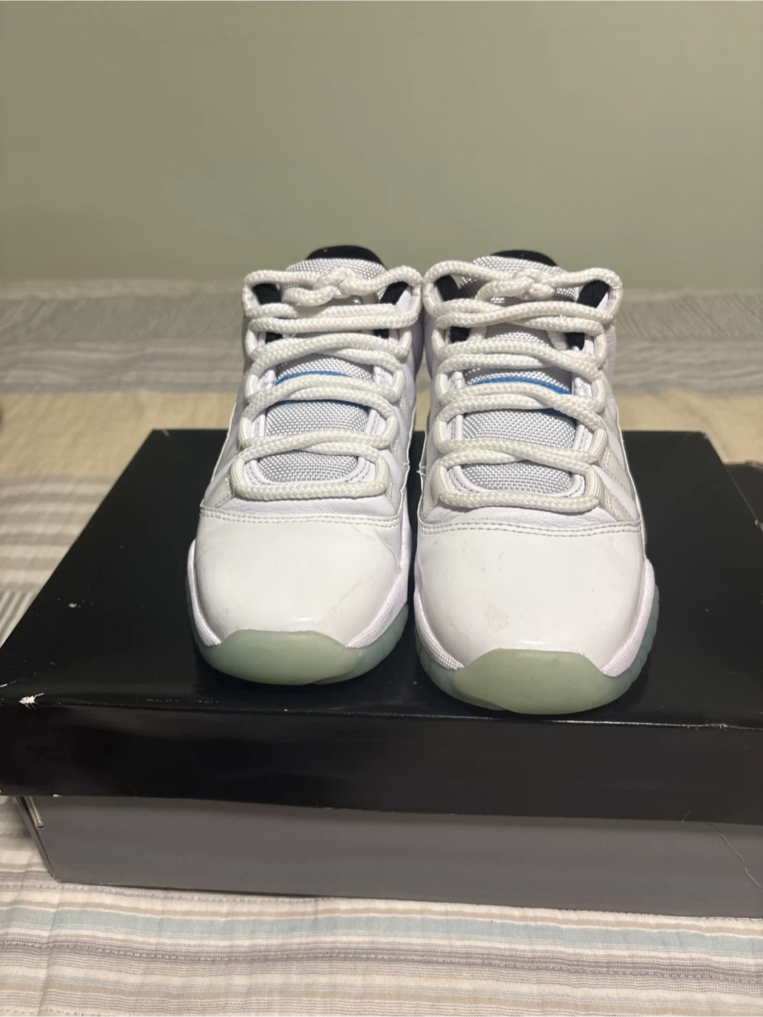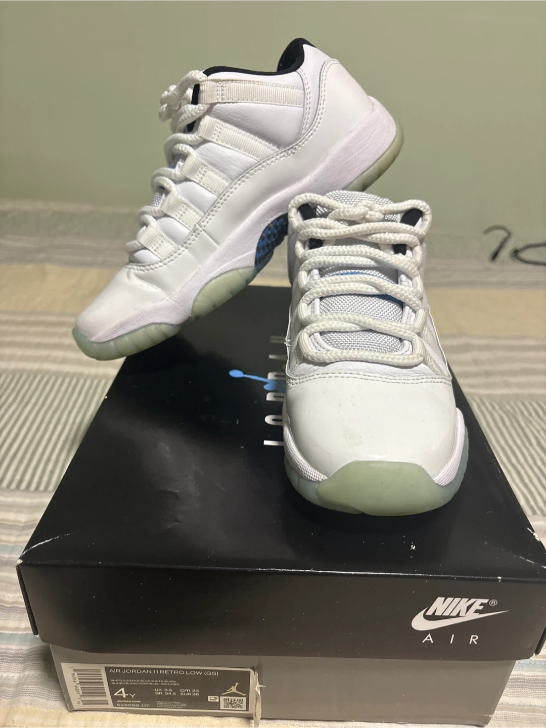 Selling a pair of Air Jordan 11 Retro Low (GS) in white, legend blue, and black. These are a size 4Y. They come with the original box!